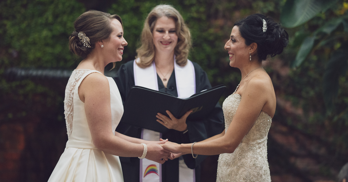 The two were married in Midtown on October 20, 2018, by officiant Leslie Bonnie in the outdoor courtyard of Brennan’s restaurant. Music was performed by a string trio, and both women were escorted down the aisle by their fathers to exchange vows that they had written. One unique component of their big day was having two caricature artists there to create custom caricature portraits of their guests.