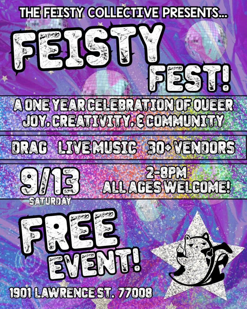 The Feisty Collective hosts a parking lot bash for its one-year anniversary featuring drag shows, a vendor market, bounce house, photo booth, and more. 1901 Lawrence St. 2 p.m.