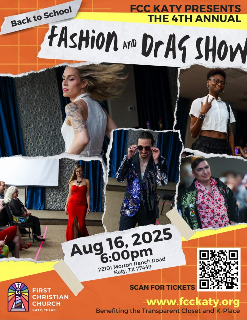 First Christian Church Katy presents the 4th annual Fashion and Drag Show benefitting Transparent Closet, a free clothing boutique for youth, teens, and young adults who are transitioning or gender exploring. 22101 Morton Ranch Rd. Katy. 6 p.m.