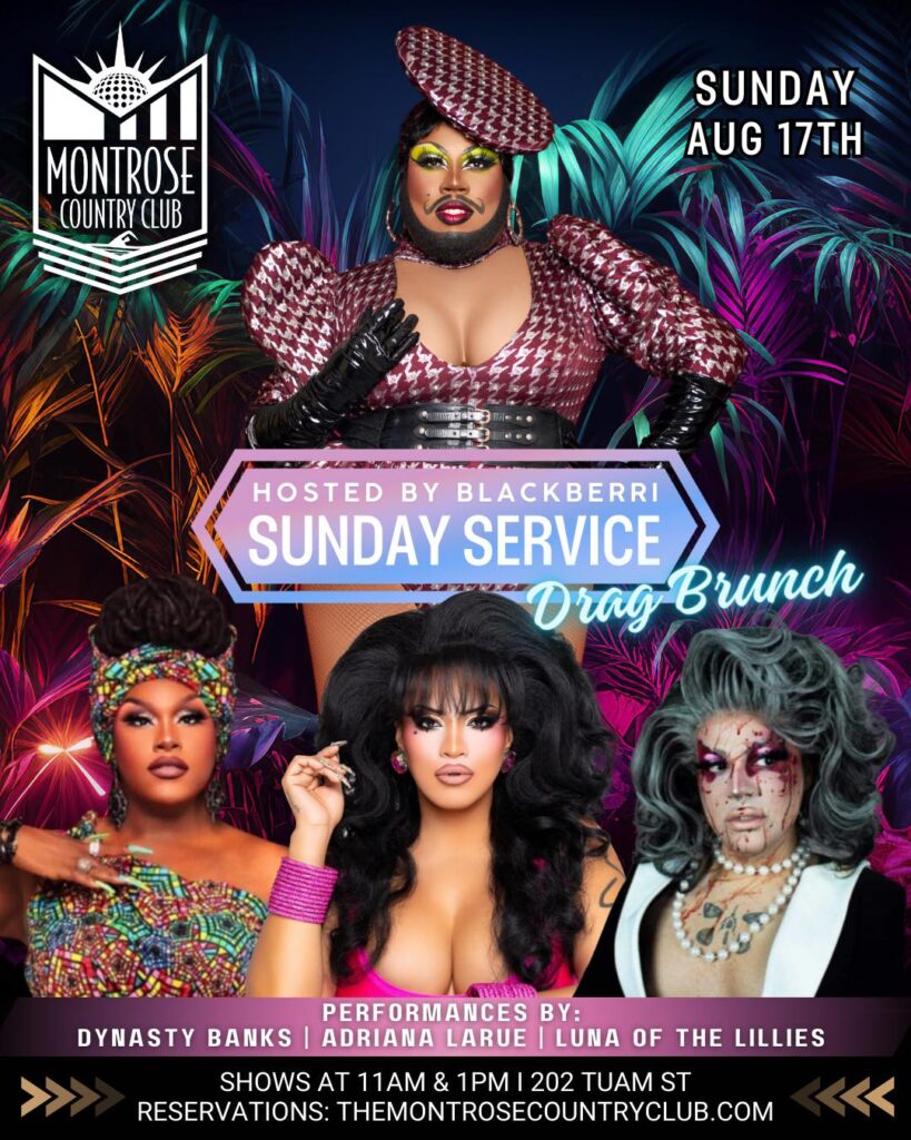 The Montrose Country Club presents Sunday Service Drag Brunch. Blackberri hosts shows featuring performances by Dynasty Banks, Adriana LaRue, and Luna of the Lilies. 202 Tuam St. Shows at 11 a.m. and 1 p.m.