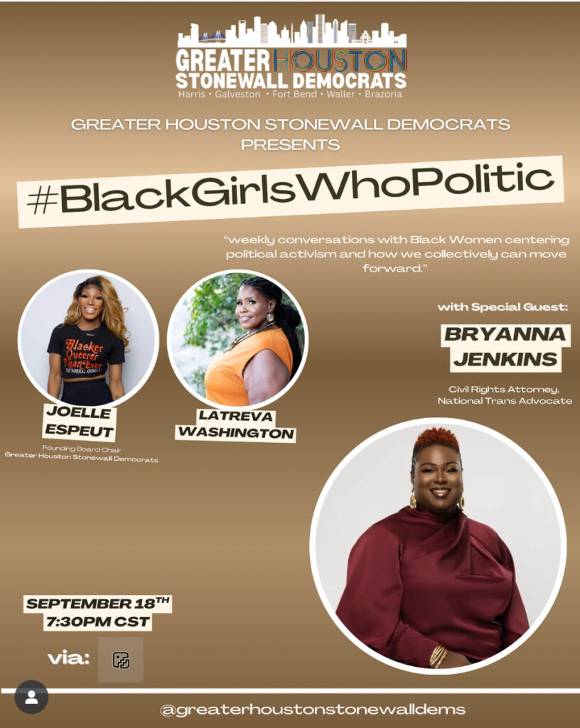 Join the Greater Houston Stonewall Democrats for the forst installment of “Black Girls Who Politic,” a new Instagram series centering intersectionality and Black Womanhood and political and community advocacy. With Joelle Espeut, Latreva Washington, and special guest Bryanna Jenkins. 7:30 p.m.