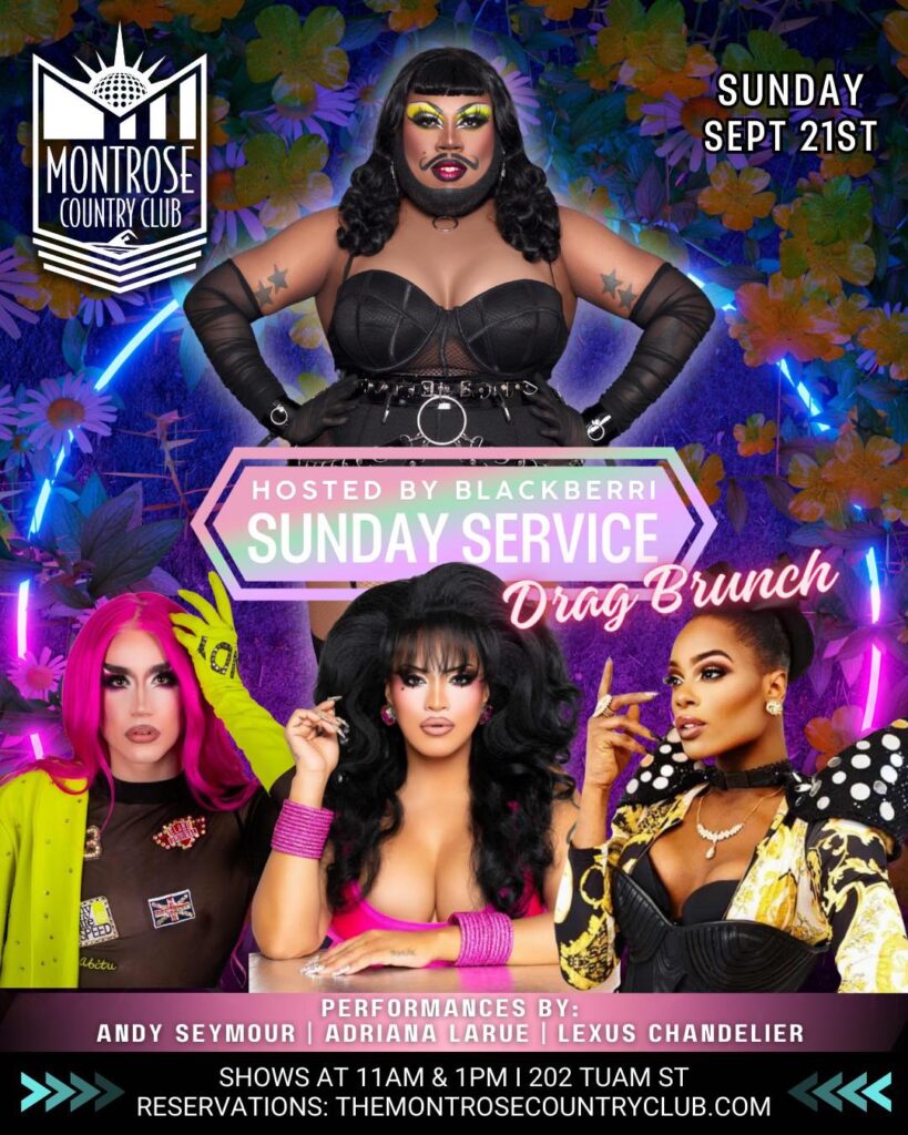 The Montrose Country Club presents Sunday Service Drag Brunch. This week, Blackberri hosts shows featuring spectacular performances from Andy Seymour, Adriana LaRue, and Lexus Chandelier. 202 Tuam St. Shows at 11 a.m. and 1 p.m.