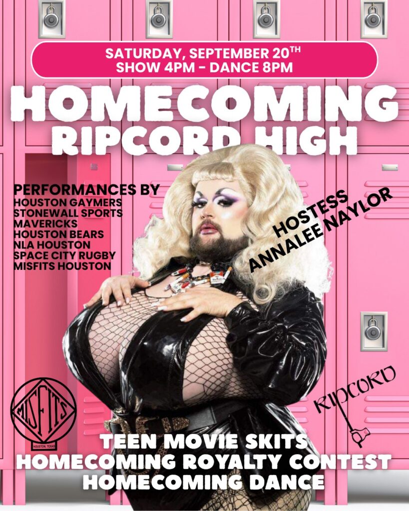 Welcome to Homecoming at Ripcord High! Hosted by Annalee Naylor, there will be teen movie skits by Houston Gaymers, Stonewall Sports, the Mavericks, Houston Bears, NLA Houston, Space City Rugby, and Misfits Houston. 715 Fairview St. 4 p.m.