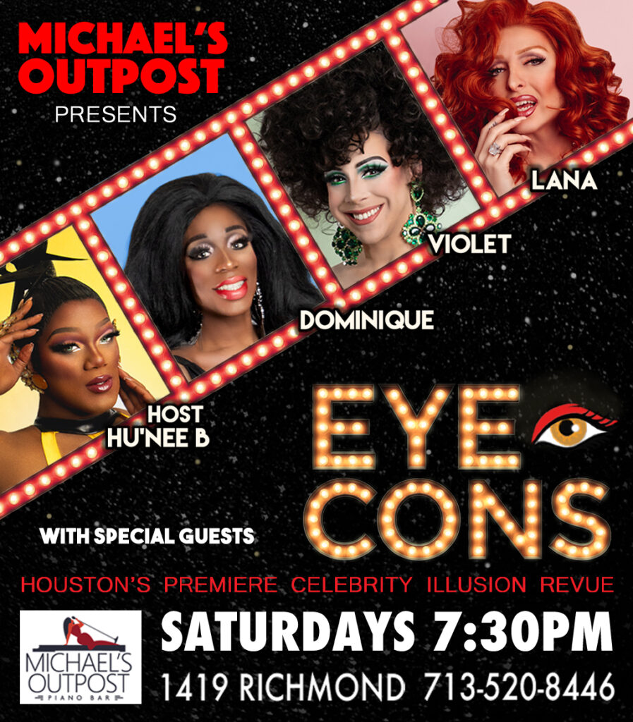 Michael’s Outpost presents Eye Cons, Houston’s longest-running celebrity impersonation revue with host Hu’Nee B. This week, resident cast members are joined by special guests Kale A’Lily and Dina Jacobs. 1419 Richmond Ave. 7:30 p.m.