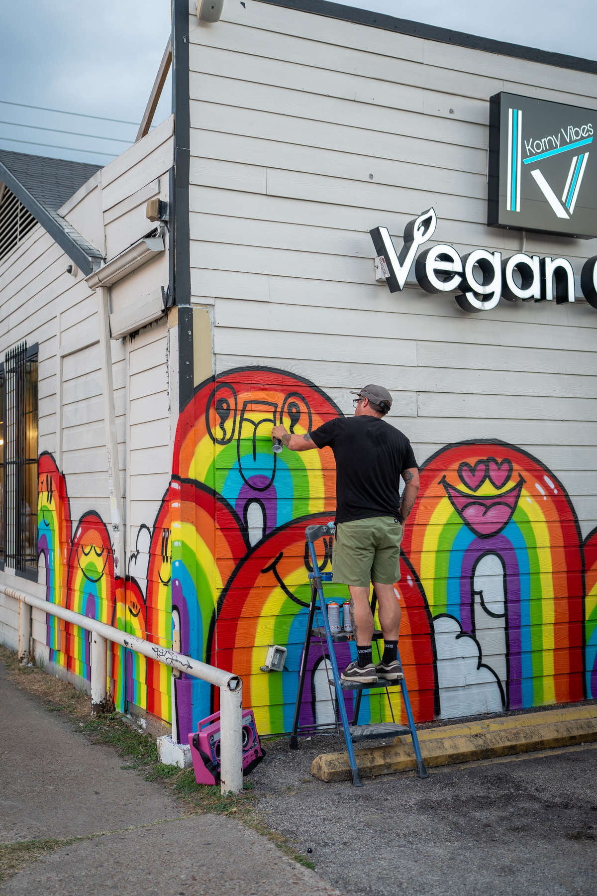 After Houston’s rainbow crosswalk was removed, local muralist Nicky Davis posted a comment on an online Houston Chronicle article, offering to paint a free rainbow-themed mural for any nearby business. The community quickly suggested the Korny Vibes Vegan Café, located at the intersection facing the crosswalk. Davis reached out to the owners, and they were thrilled with his proposal.