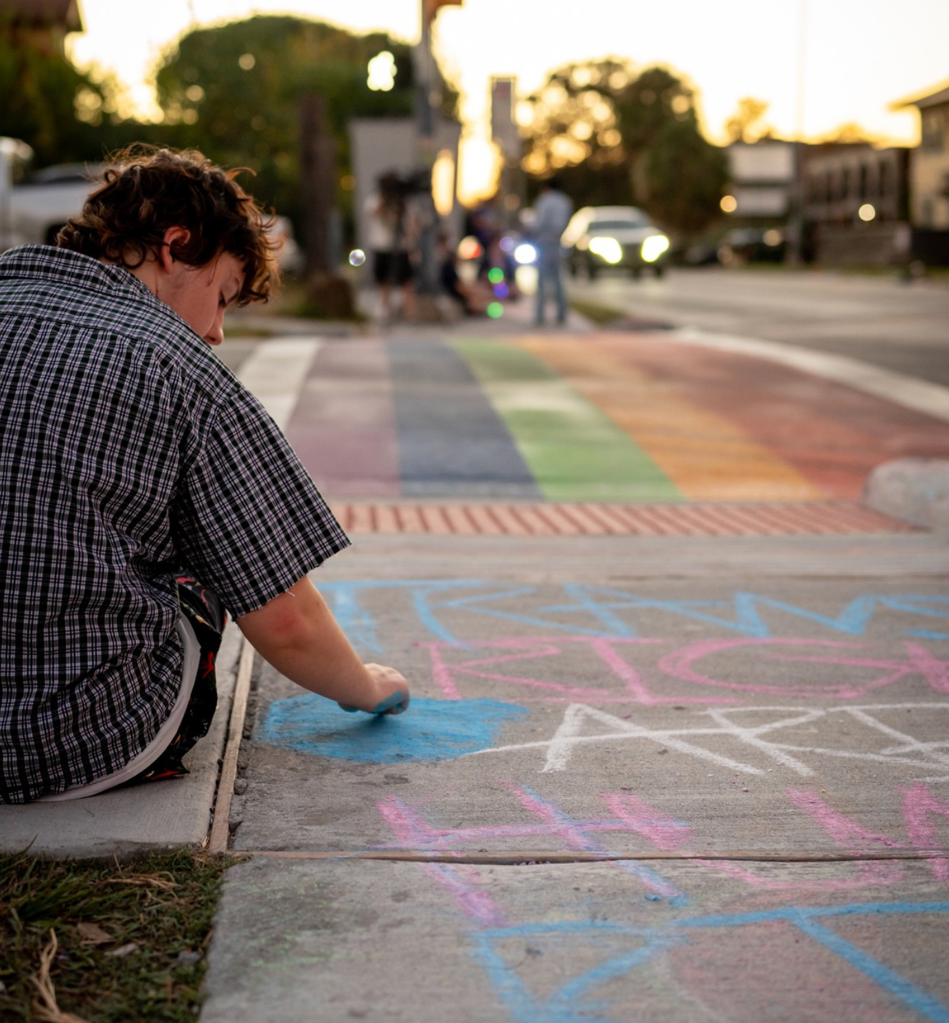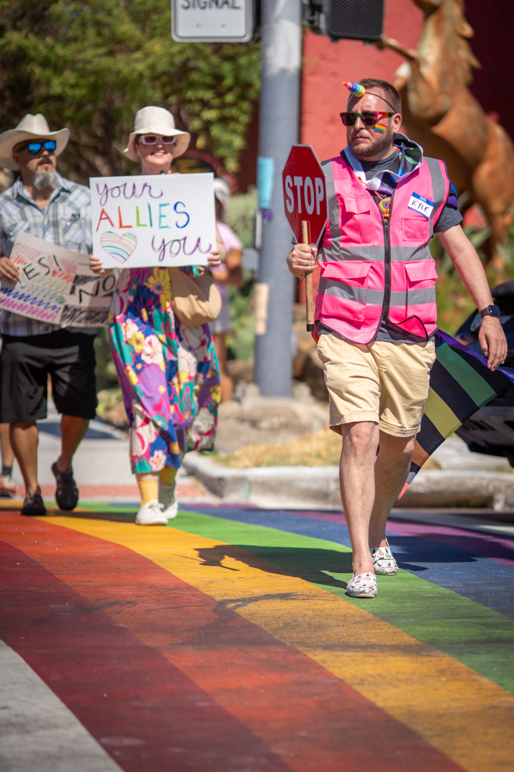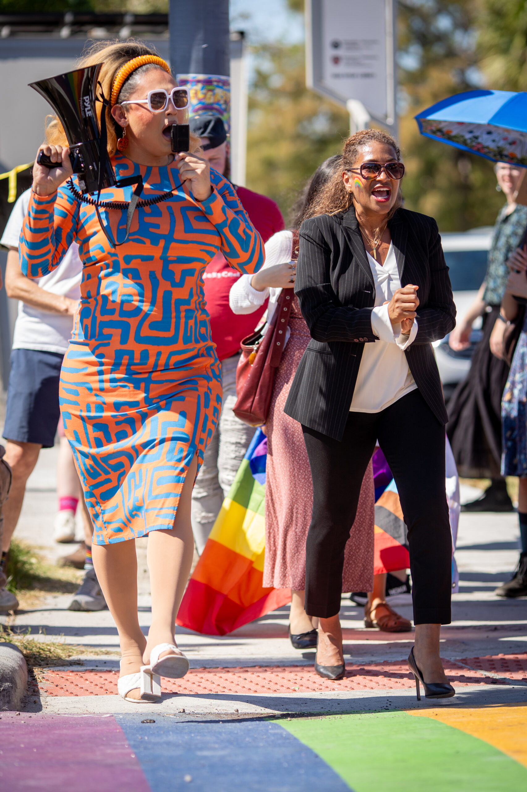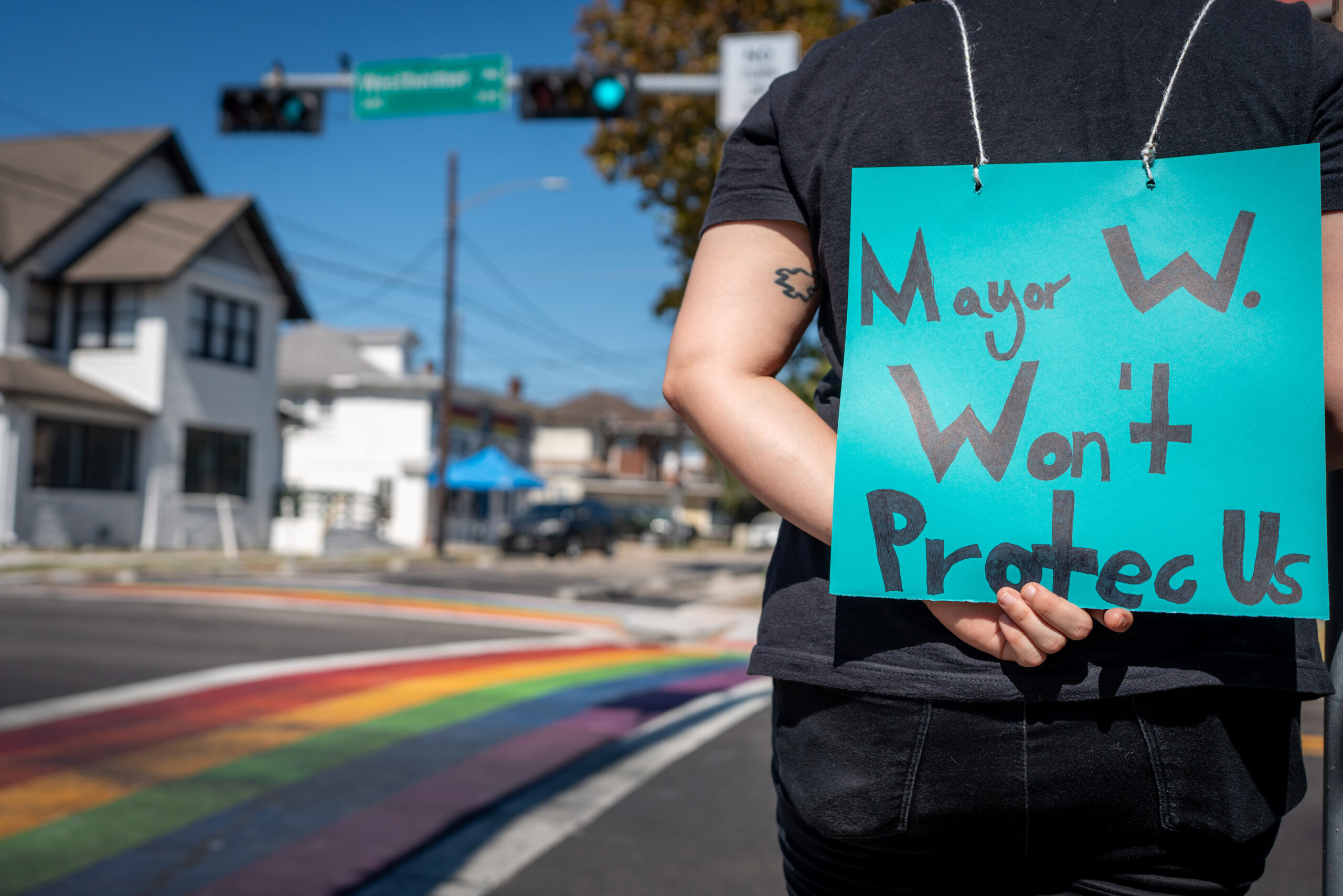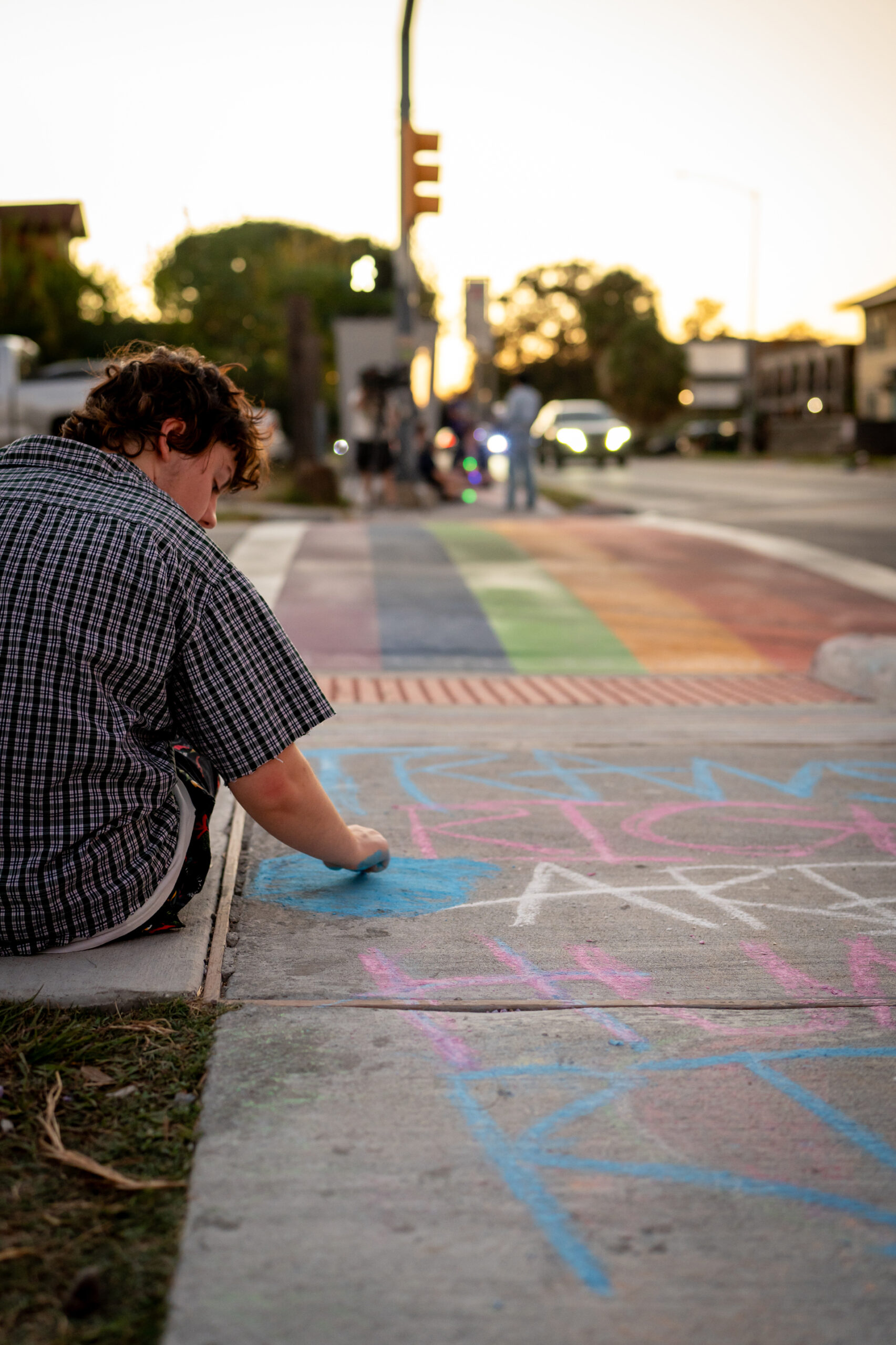 Hundreds of residents gathered at the intersection Sunday night to protest. Demonstrators waved Pride flags, chanted, and created chalk drawings on nearby sidewalks in response to what they viewed as a politically motivated order. Early Monday, four protesters were arrested after blocking the street as work crews arrived.