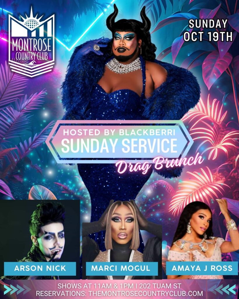 The Montrose Country Club presents Sunday Service Drag Brunch. This week, Blackberri hosts shows featuring spectacular performances from Arson Nick, Marci Mogul, and Amaya J Ross. Shows at 11 a.m. and 1 p.m.