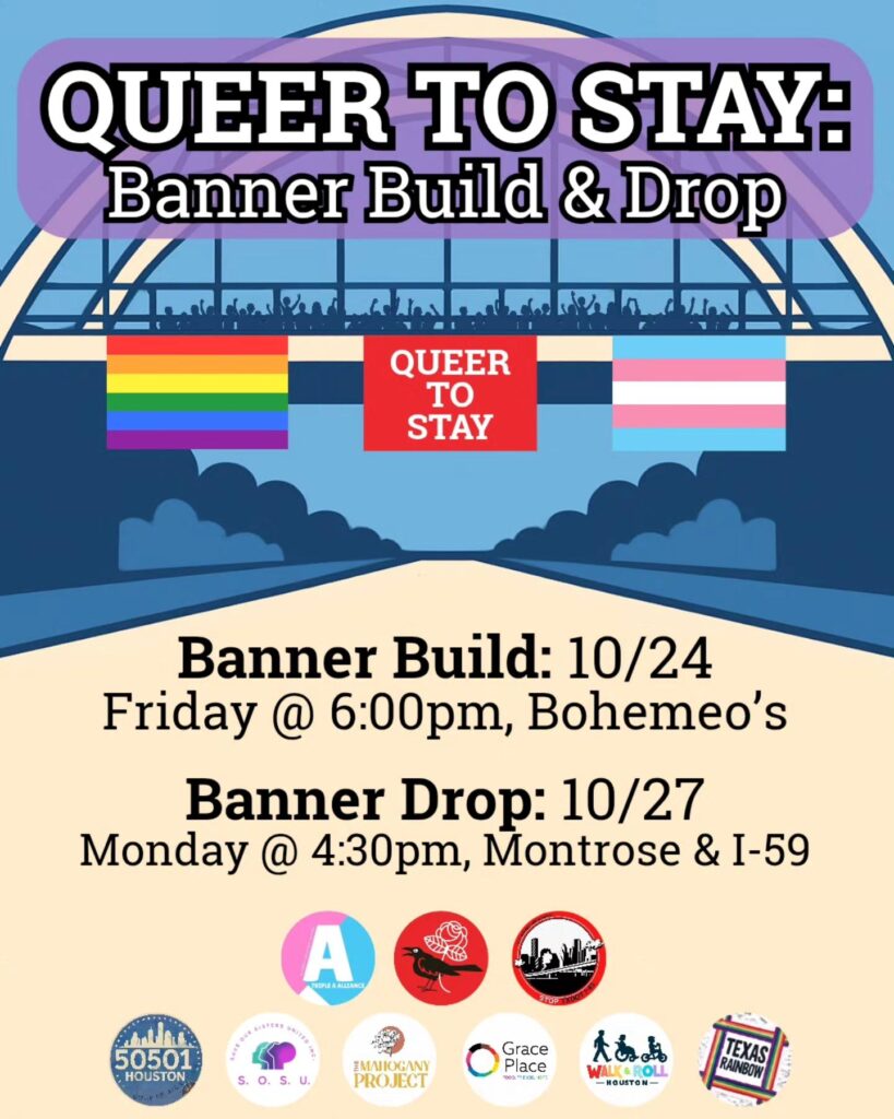 Join community groups including Triple A Alliance, Save Our Sisters United, The Mahogany Project, and Grace Place at Bohemeo’s to create banners and signs that will be displayed on the Montrose Blvd overpass at US59. Banner build: Bohemeo’s, 708 Telephone Rd. 6 p.m. Banner drop: Monday, October 27 at Montrose Blvd. and US59. 4:30 p.m.