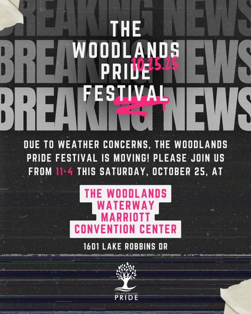 The Woodlands Pride is an annual LGBTQ+ pride festival and celebration that takes place in The Woodlands, Texas. The festival features live music, entertainment, food vendors, and more. The Woodlands Waterway Marriott Convention Center, 1601 Lake Robbins Dr. 11 a.m.