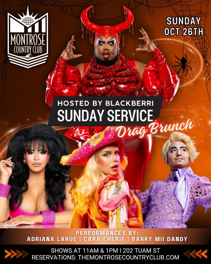 The Montrose Country Club presents Sunday Service Drag Brunch. This week, Blackberri hosts shows featuring spectacular performances from Adriana LaRue, Cara Cherie and Barry Mii Dandy. Shows at 11 a.m. and 1 p.m.