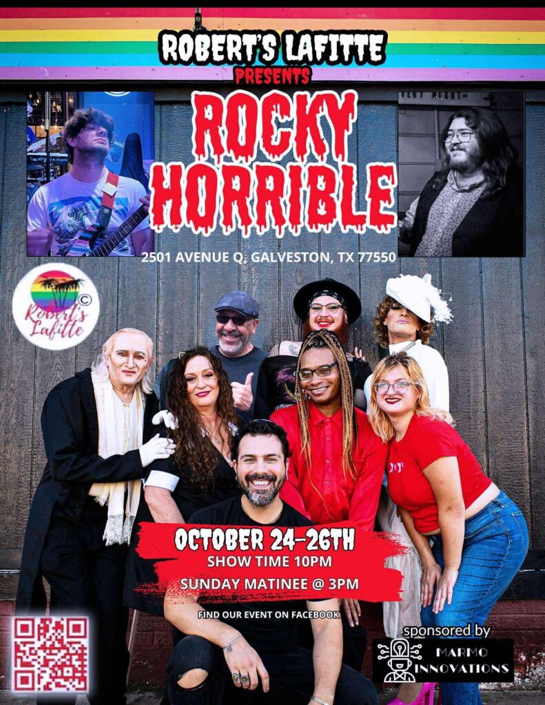 The Rocky Horrible Show returns to Galveston’s Robert’s Lafitte for three performances. Featuring drag stars, seasoned performers, and first-timers, the 2025 cast—led by Lucio Nieto as Frank-N-Furter and Fallon Smith as director—delivers camp, creativity, and community spirit. 2501 Ave. Q Galveston. Friday and Saturday at 10 p.m.; Sunday matinee at 3 p.m.