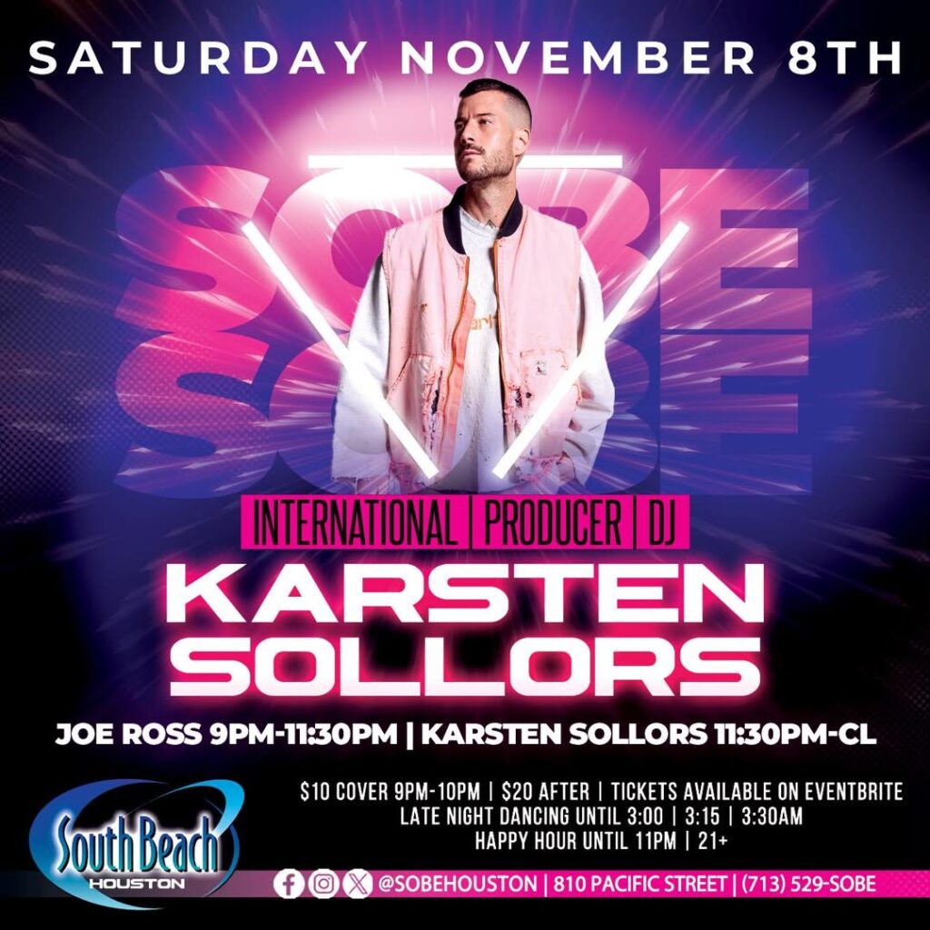 Get ready for a night of deep grooves, soulful vocals, and infectious house rhythms as South Beach Houston welcomes back international DJ Karsten Sollors. House DJ Joe Ross spins from 9 p.m. 810 Pacific St. 11:30 p.m.