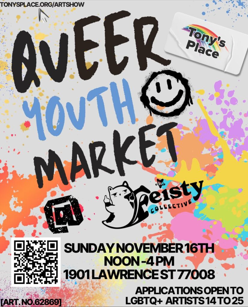 Tony’s Place and The Feisty Collective team up to celebrate the creativity and talent of Houston’s LGBTQ youth with a fun, inclusive art market showcasing young queer artists and creatives. Participation is free, and the artists keep all the money they make in sales. 1901 Lawrence St. 12 p.m.