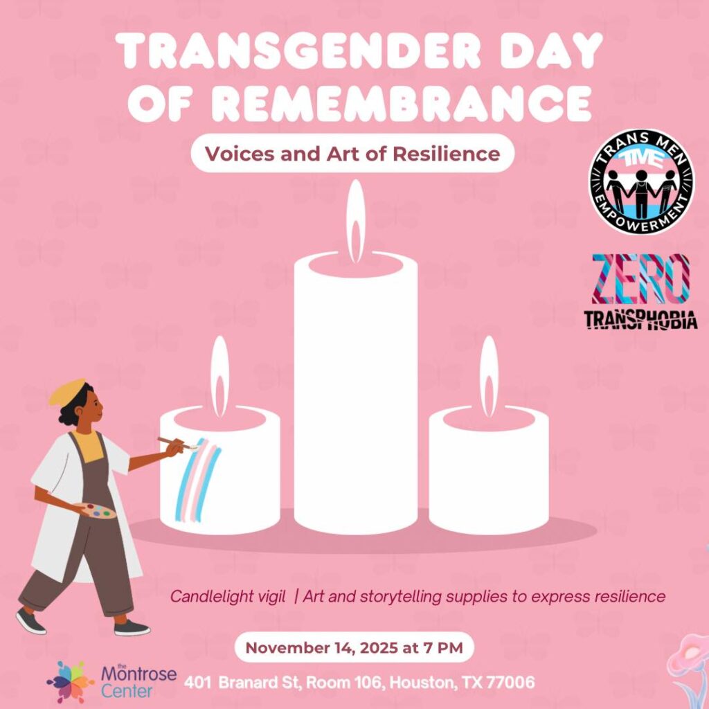 Join TME for Voices and Art of Resilience — a Transgender Day of Remembrance event centered on healing, creativity, and community connection. The Montrose Center, 401 Branard St. 7 p.m.