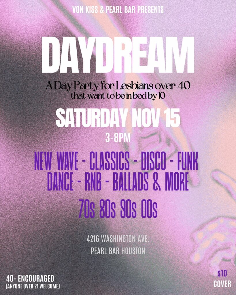 Von Kiss and Pearl Bar present Daydream, a day party for lesbians over 40 and their admirers featuring music from the ’70s through the ’00s. 4216 Washington Ave. 3 p.m.