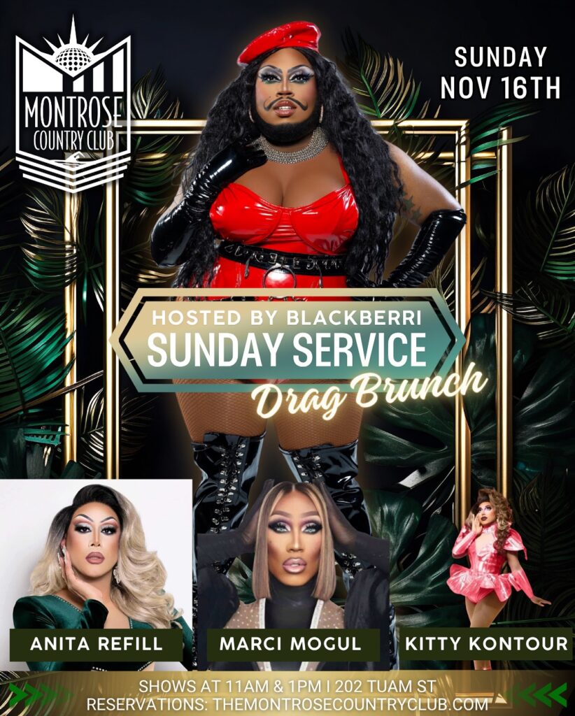 The Montrose Country Club presents Sunday Service Drag Brunch. This week, Blackberri hosts shows featuring spectacular performances from Adriana LaRue, Cara Cherie and Mari Jane. Shows at 11 a.m. and 1 p.m.