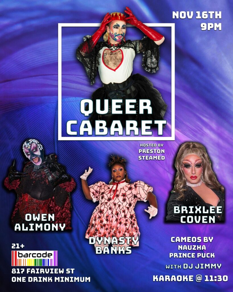 Barcode Houston presents Queer Cabaret, hosted by Preston Steamed with performances by Owen Alimony, Dynasty Banks, Brixlee Coven, and more. 817 Fairview St. 9 p.m.
