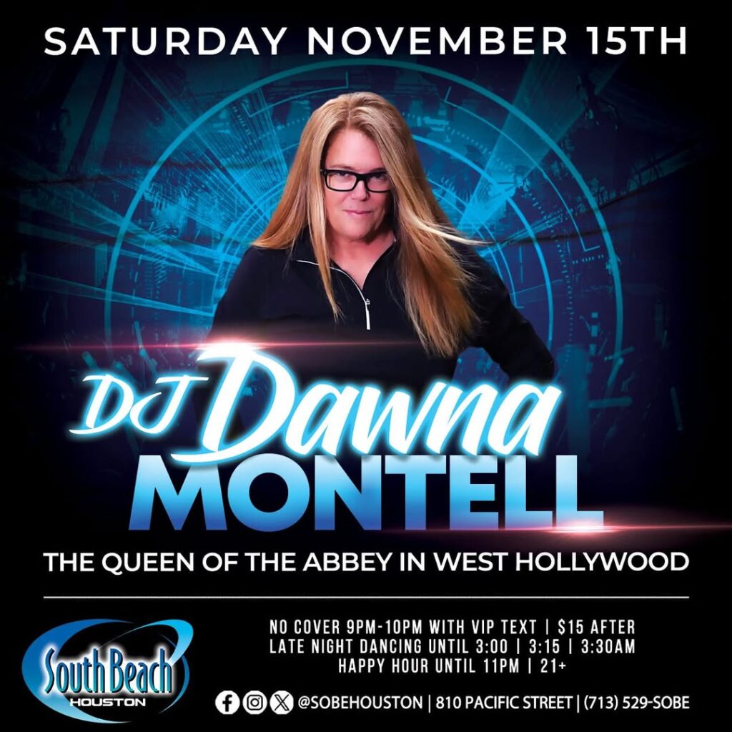 South Beach Houston welcomes back DJ Dawna Montell. Known for her high-energy sets that blend uplifting house, fierce vocals, and irresistible grooves, Dawna brings the same fire that’s made her a staple at The Abbey in West Hollywood. 810 Pacific St. 9 p.m.
