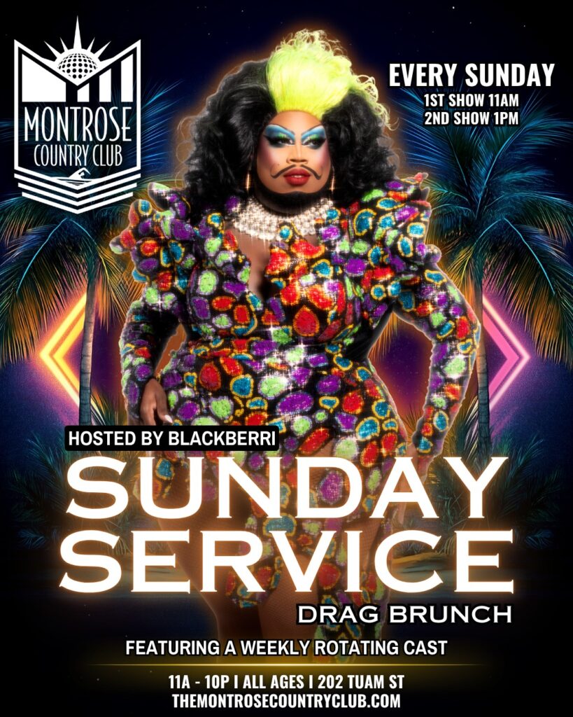 The Montrose Country Club presents Sunday Service Drag Brunch. This week, Blackberri hosts shows featuring spectacular performances from a rotating cast. Shows at 11 a.m. and 1 p.m.