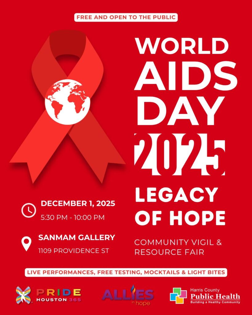 Pride Houston 365, in partnership with Allies in Hope and Harris County Public Health, commemorates World AIDS Day 2025. Enjoy live performances, free testing, mocktails, and light bites. Sanman Gallery, 1109 Providence St. 5:30 p.m.
