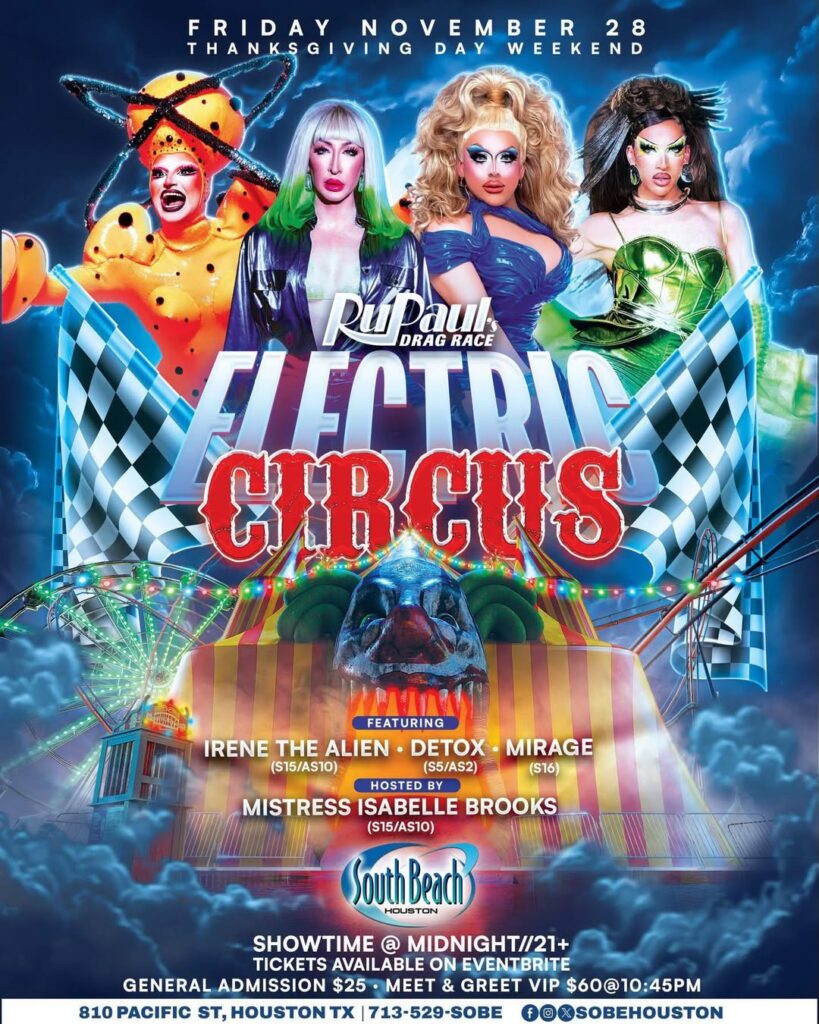 RuPaul’s Drag Race Electric Circus comes to South Beach Houston, hosted by Mistress Isabelle Brooks, featuring Irene the Alien, Detox, and Mirage. 810 Pacific St. 9 p.m.
