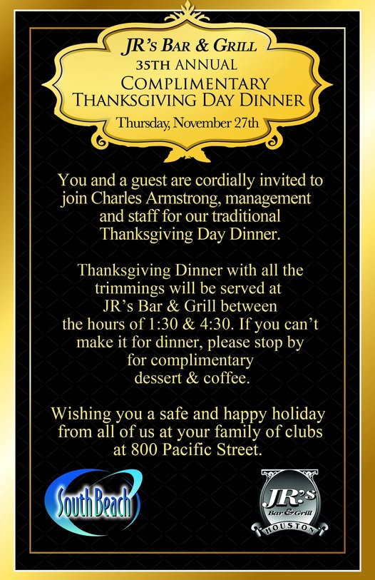 JR’s 35th Annual Complimentary Thanksgiving Day Dinner