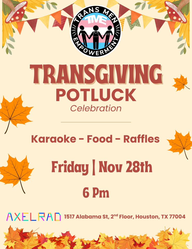 Come celebrate Transgiving with the Trans Men Empowerment family: food, karaoke, raffles, and lots of love. Everyone is welcome. Bring something to share if you can! Axelrad, 1517 Alabama St. 6 p.m.