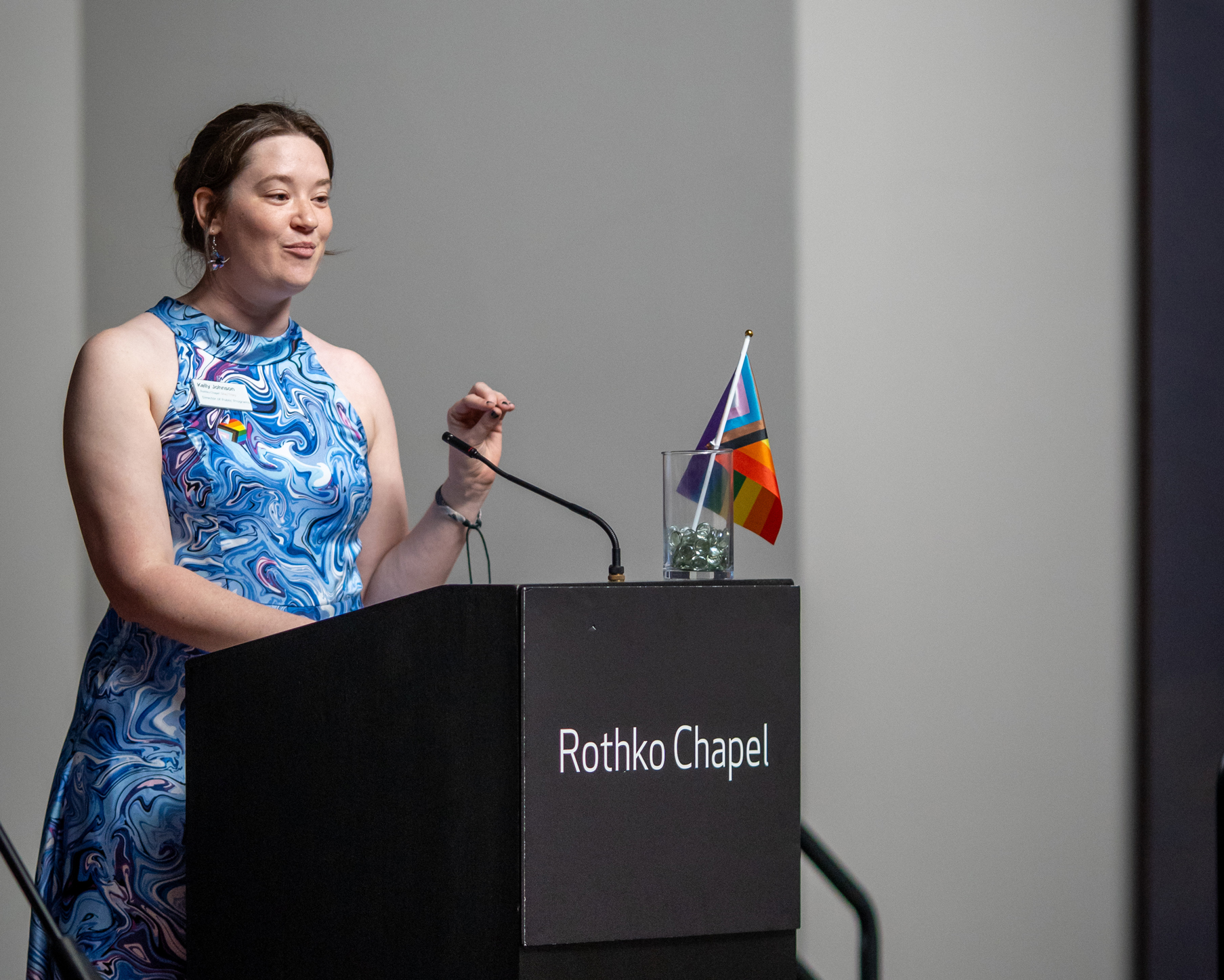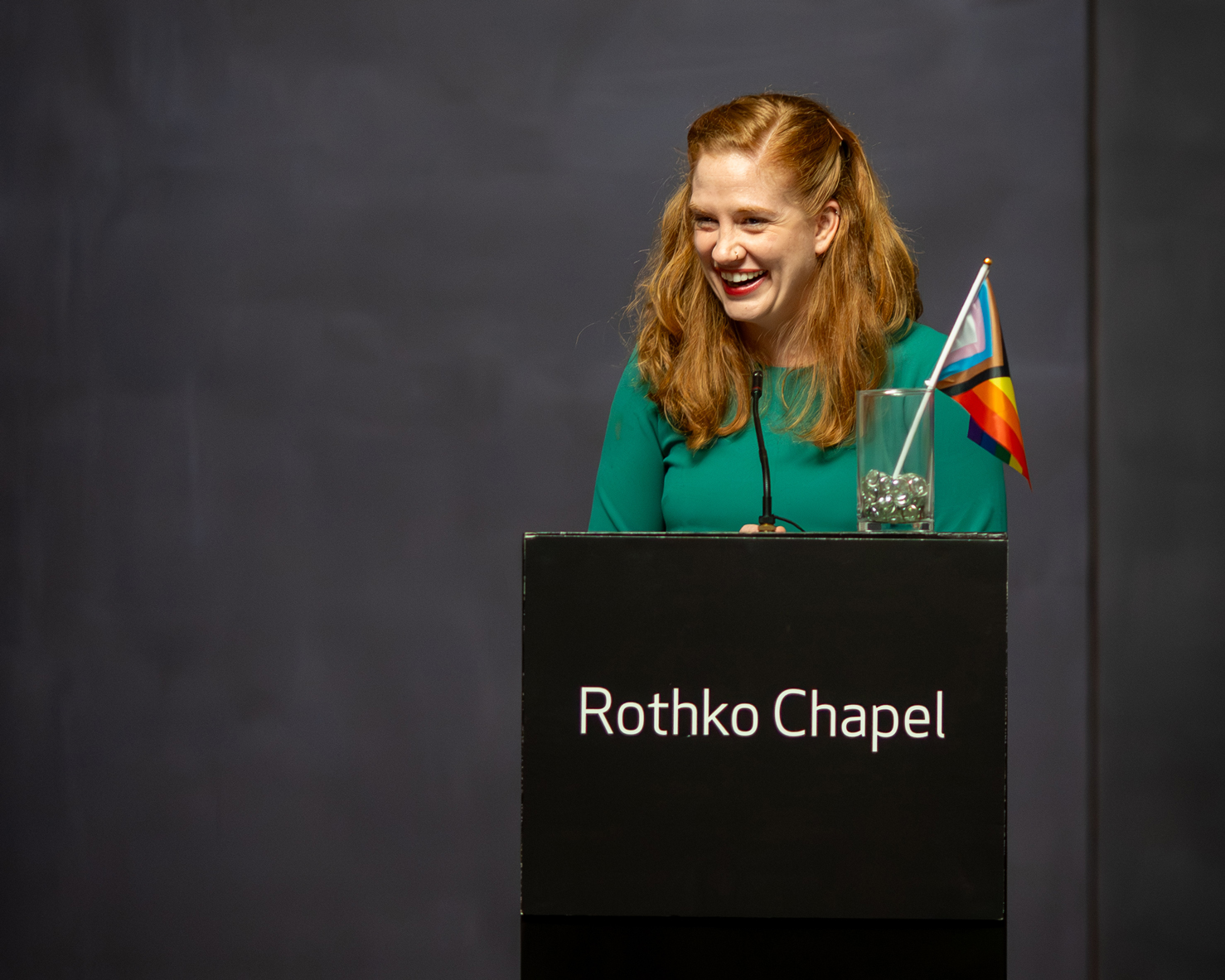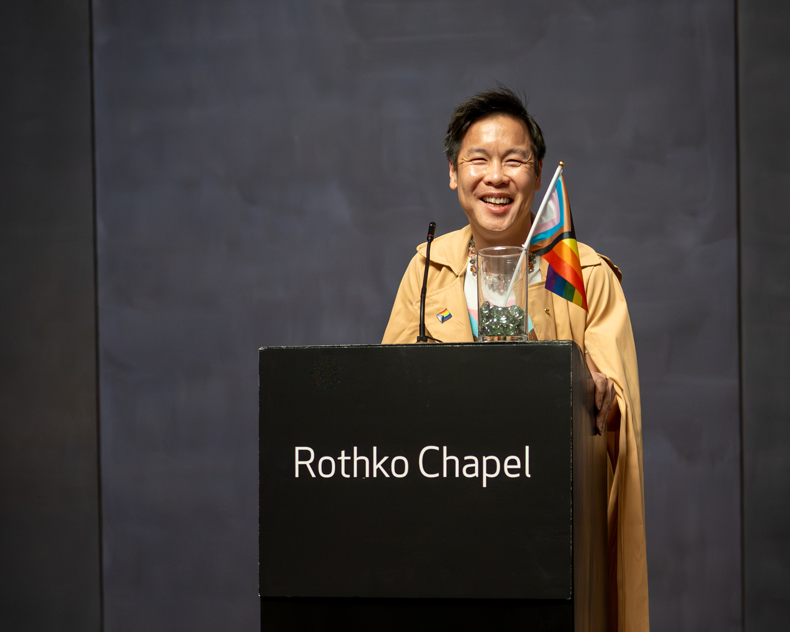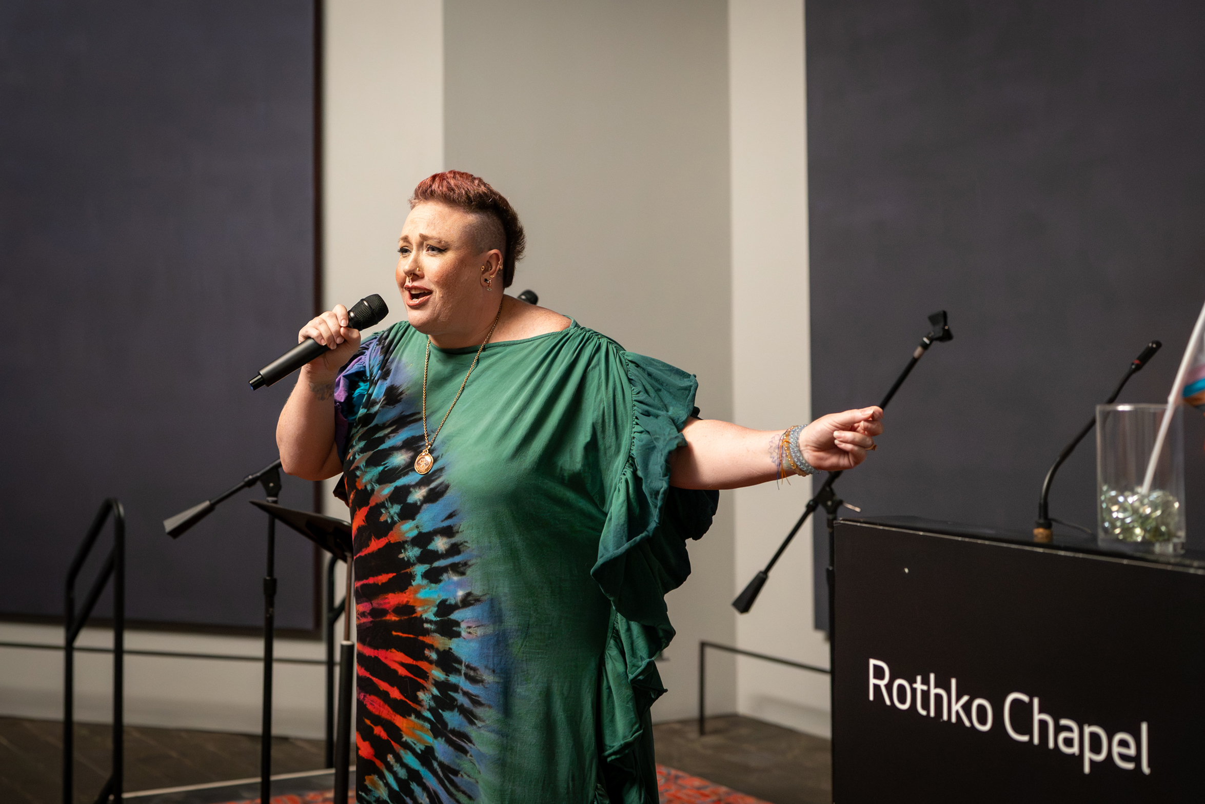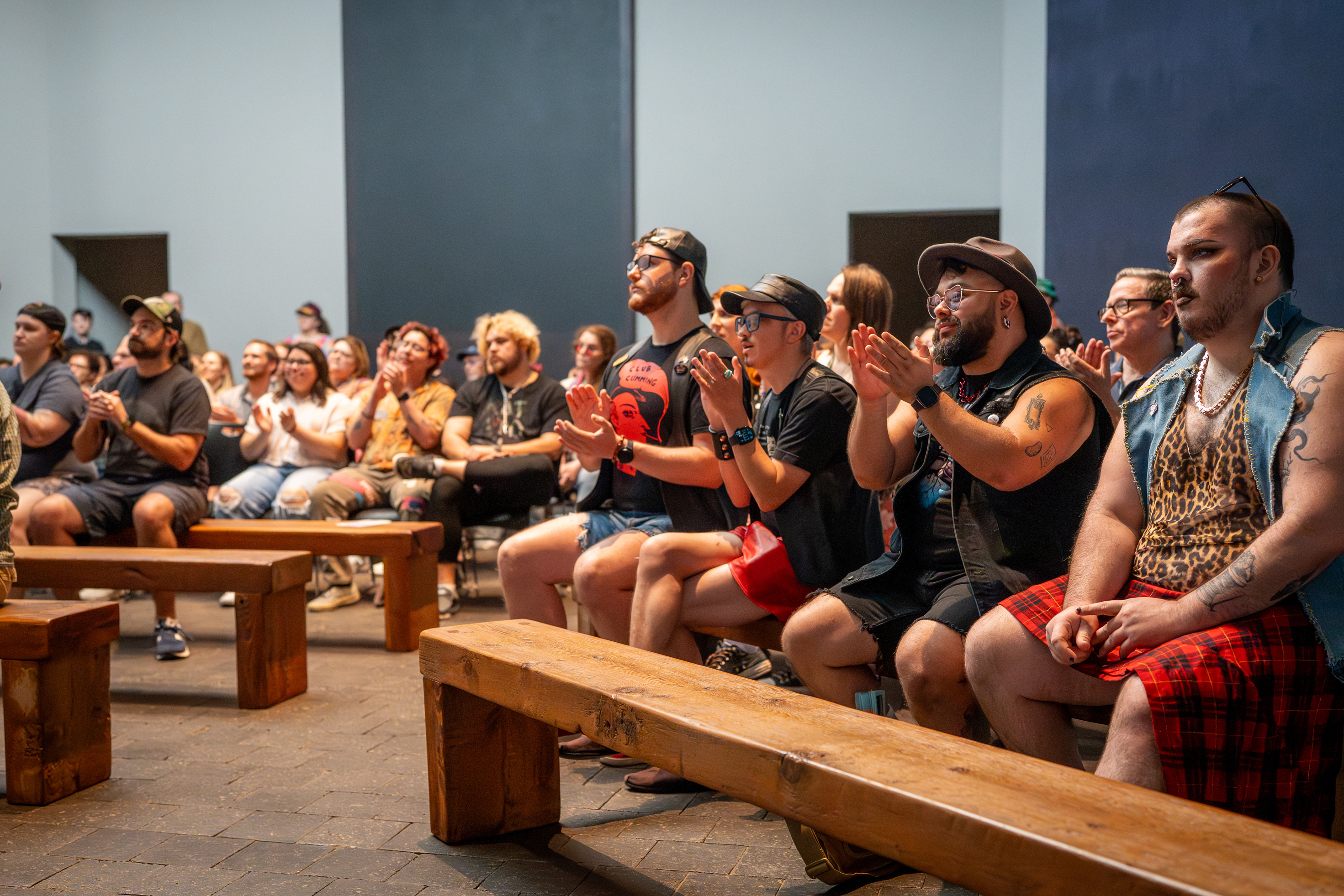 Inside the Chapel sanctuary, audiences settled in as a lineup of poets, musicians, and fashion-forward performers took the mic. Speakers included Texas State Senator Molly Cook and Kevin Nguyen, the Montrose Center’s Director of Community Engagement. A limited open mic offered LGBTQ poets and musicians a space to share new work, while the fashion contest brought bold looks to the theme “Revolution of Joy,” with categories for Best Design, Wore It Best, and Best Drag. Winners each received $100 gift cards.