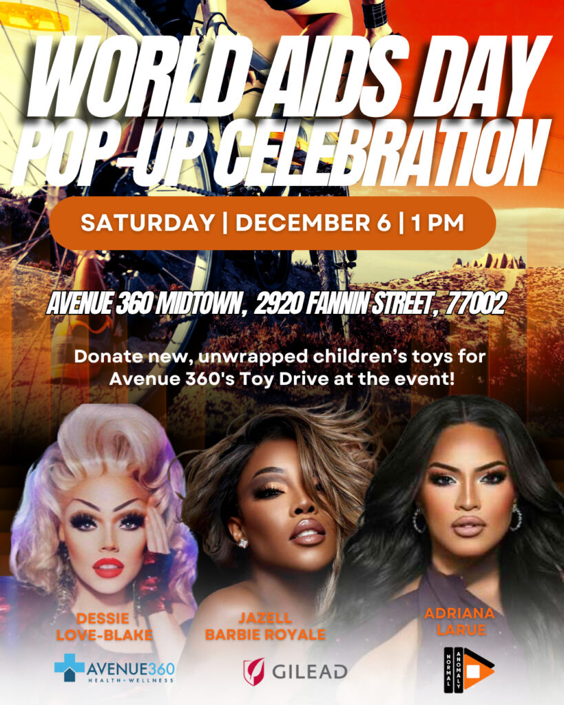 Avenue 360 Health and Wellness, in partnership with The Normal Anomaly Inc., presents a World AIDS Day pop-up event hosted by Titan Capri, with performances by Dessie Love-Blake, Jazelle Barbie Royale, and Adraina LaRue. Bring a new, unwrapped children’s toy for the toy drive. 2920 Fannin St. 1 p.m.