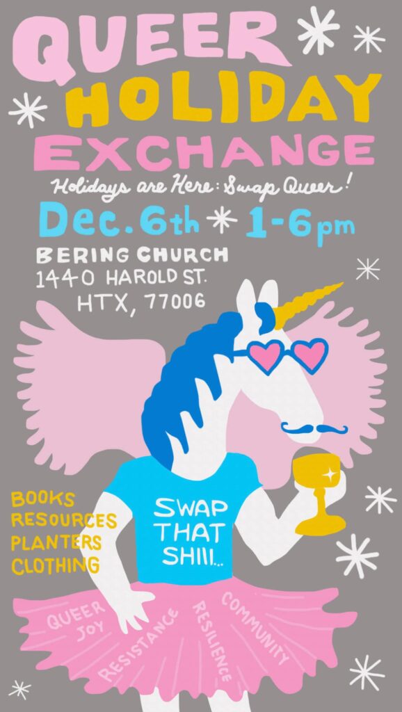 Bering Church hosts a queer holiday exchange. Swap queer, spread some cheer! Exchange clothes, books, art supplies, plants, resources, and more. Bring gently used items to donate/trade with others. 1440 Harold St. 1 p.m.