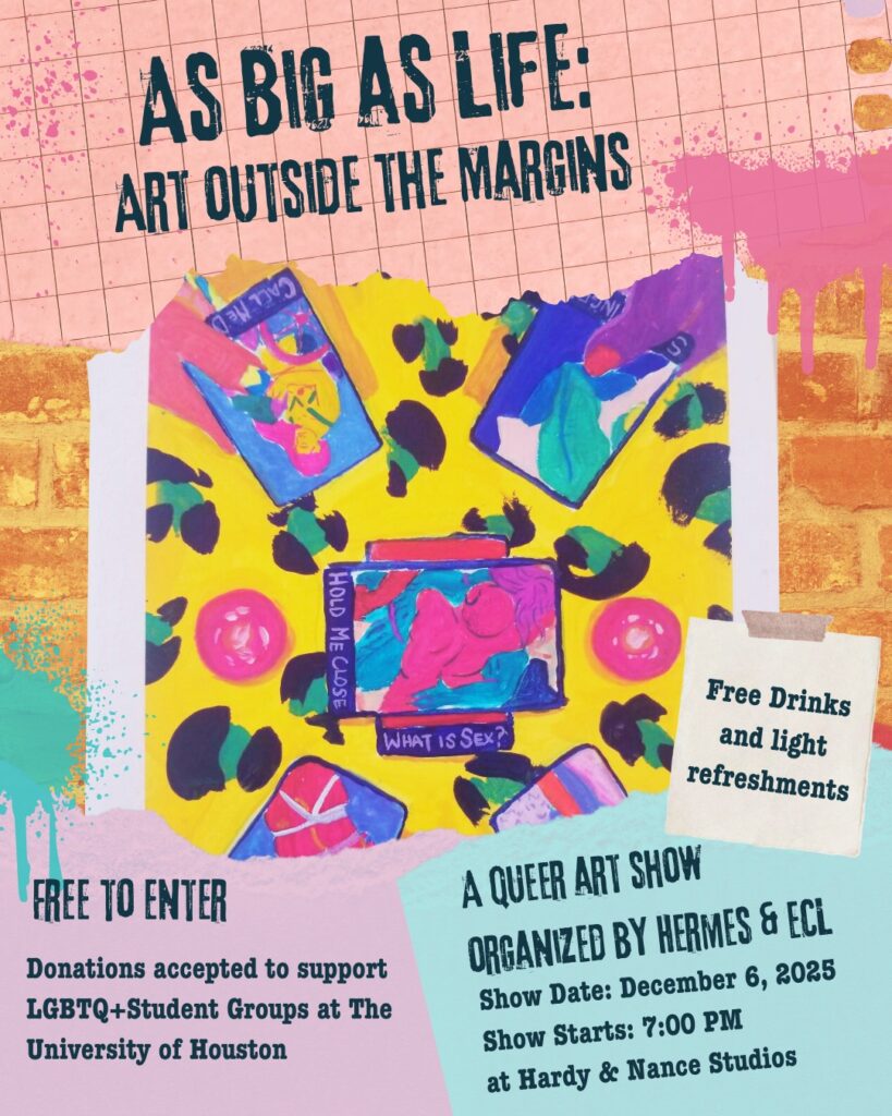 Hardy & Nance Studios hosts As Big as Life: Art Outside the Margins, a queer art show benefitting LGBTQ student groups at the University of Houston. Free drinks and light refreshments provided. 902 Hardy St. 7 p.m.