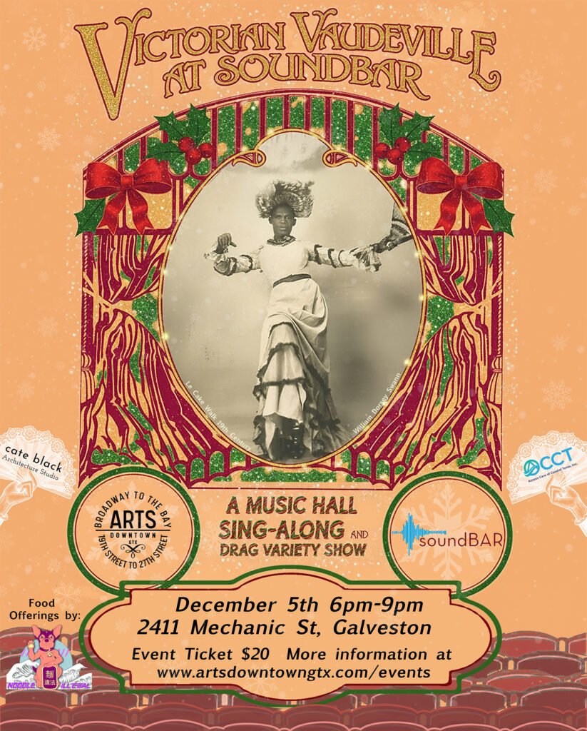 Join ARTS Downtown GTX and Soundbar for a jubilant kickoff to The Dickens Festival Weekend. A night of Victorian Vaudeville, merry music, and dazzling drag! 2411 Mechanic St., Galveston. 6 p.m.