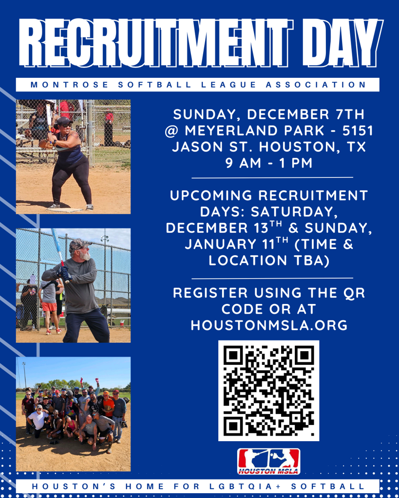 Montrose Softball League Association hosts recruitment day for new players and players currently without a team. Meyerland Park, 5151 Jason St. 9 a.m.
