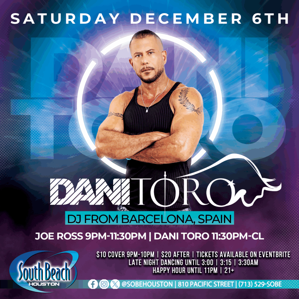 South Beach Houston welcomes international DJ Dani Toro from Barcelona, Spain. Known for his high-energy tribal and progressive house sound, Dani brings a musical intensity that keeps crowds alive from the first drop to the last beat. 810 Pacific St. 11:30 p.m.