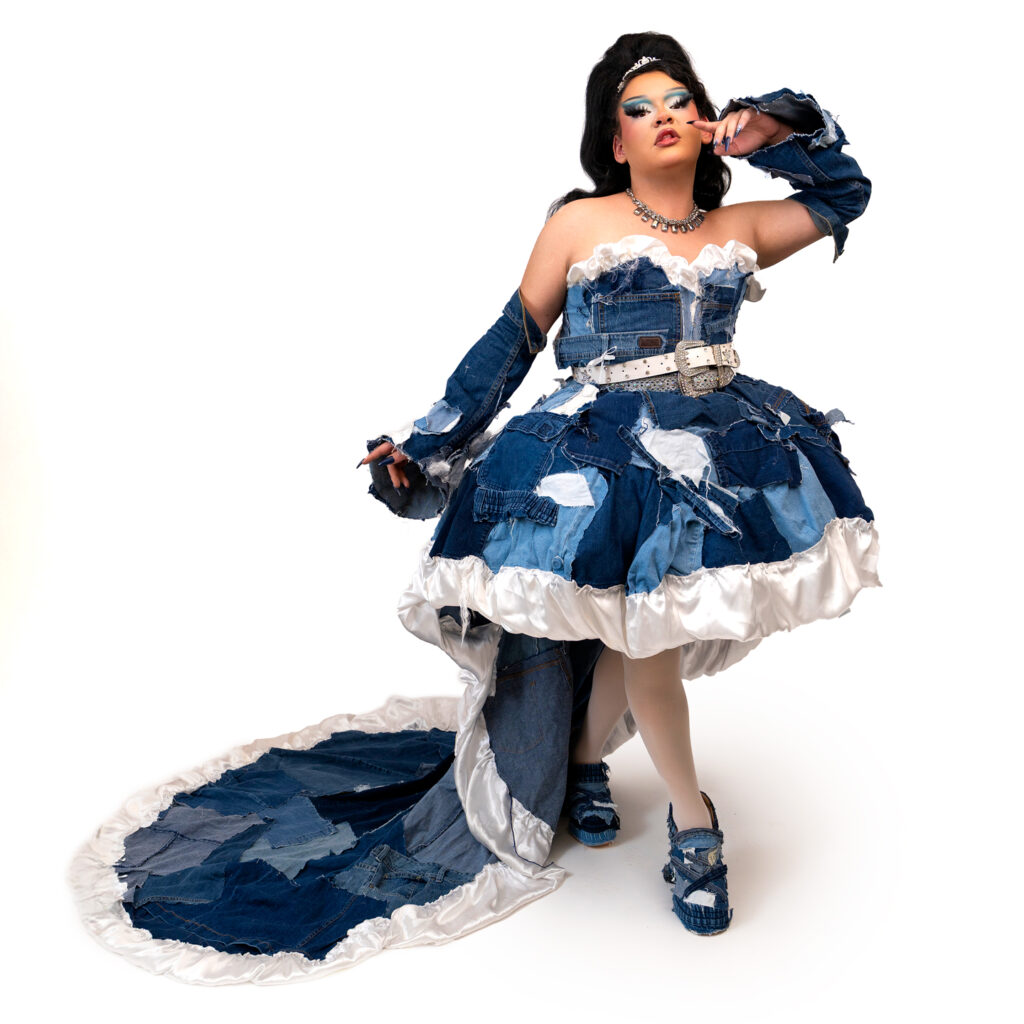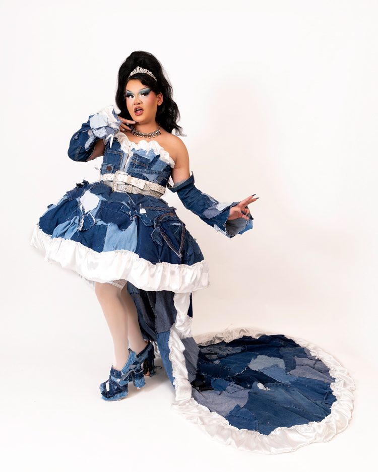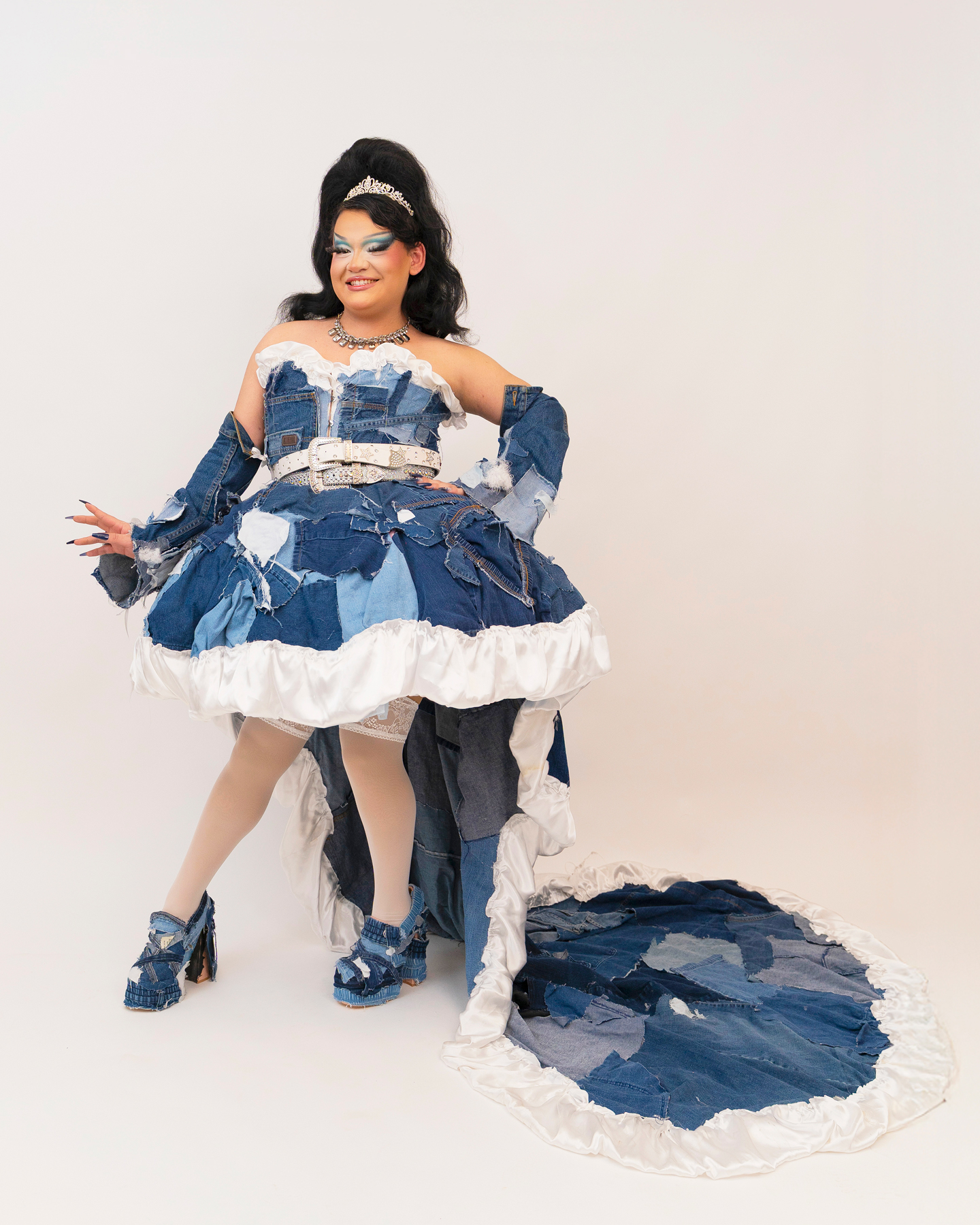 The outfit is made by me from head to toe. I constructed the skirt and bodice using thrifted denim and lined all of it with a satin bedsheet. The contrast in the denim patchwork and satin lining is a nice way to show my campy, contemporary style while also showcasing my love for a classical, glamorous aesthetic. I chose this outfit because it is symbolic of my resourcefulness and unique take on the art form of drag.