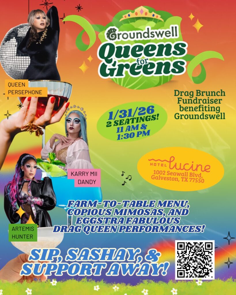 Join Queen Persephone, Karry Mii Dandy, and Artemis Hunter for a drag brunch fundraiser benefitting Groundswell. The Fancy at Hotel Lucine, 1002 Seawall Blvd., Galveston. Shows at 11a.m. and 1:30 p.m.