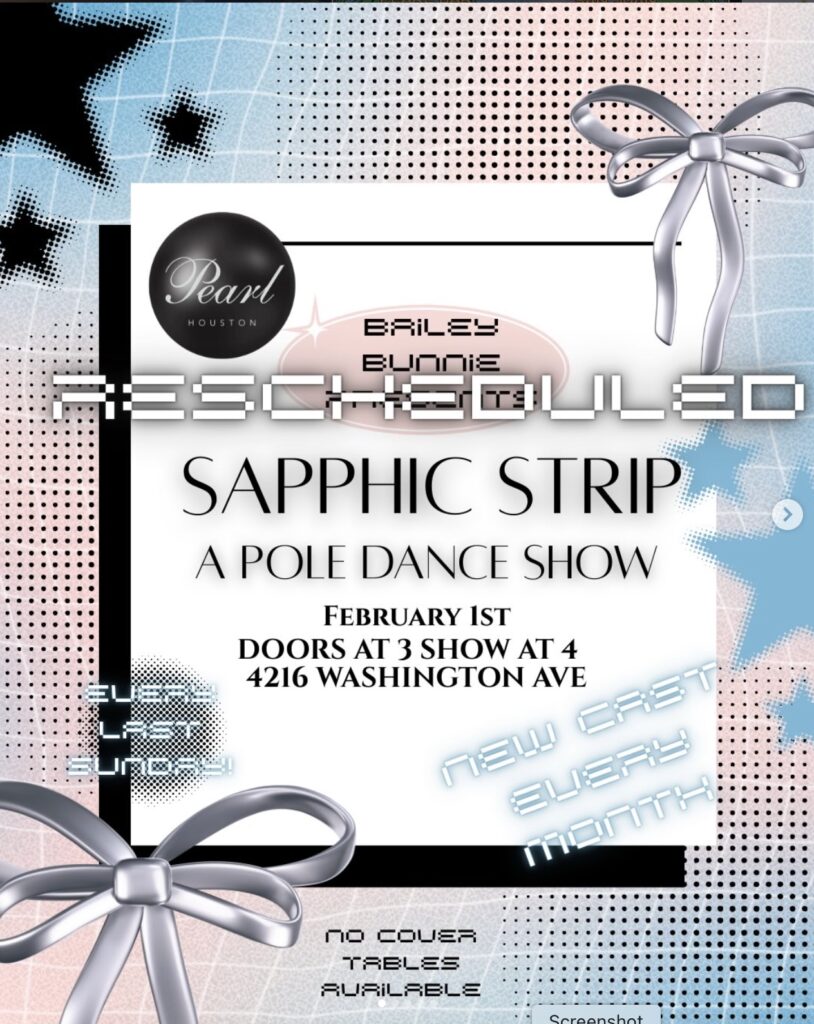 Pearl Bar presents Sapphic Strip, a pole dance show hosted by Bailey Bunnie with performances by Star Vitamin, Karolina, and Mr. Bobert. 4216 Washington Ave. 3 p.m.