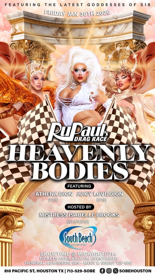 South Beach Houston presents Heavenly Bodies, a night of divine drag, celestial glamour, and otherworldly performances staring the RuPaul’s Drag Race Season 18 standouts Athena Dion and Juicy Love Dion. Hosted by Houston’s own Mistress Isabelle Brooks. 810 Pacific St. Showtime at 12 midnight.