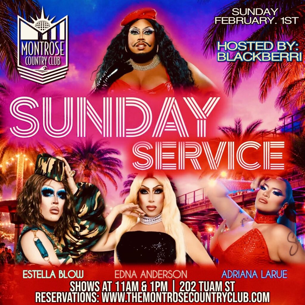 The Montrose Country Club presents Sunday Service Drag Brunch. This week, Dynasty Banks hosts shows featuring spectacular performances from Estella Blow, Edna Anderson, and Adriana LaRue. 202 Tuam St. Shows at 11 a.m. and 1 p.m.