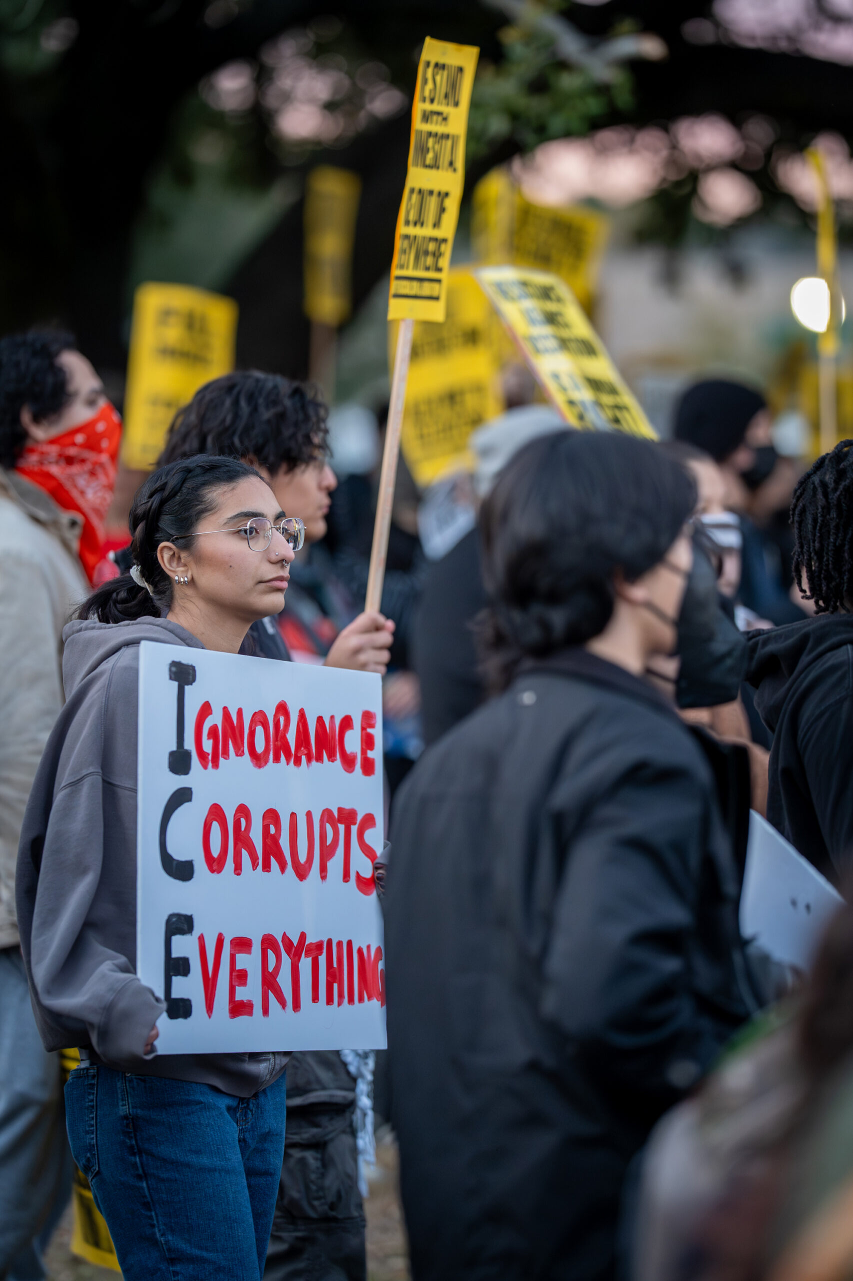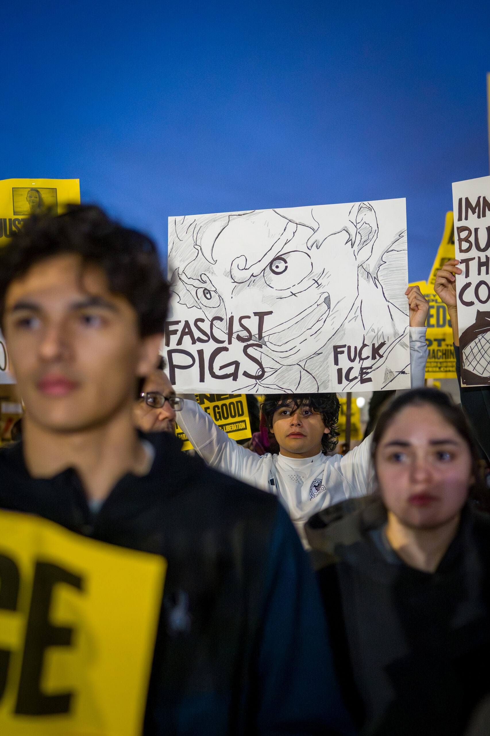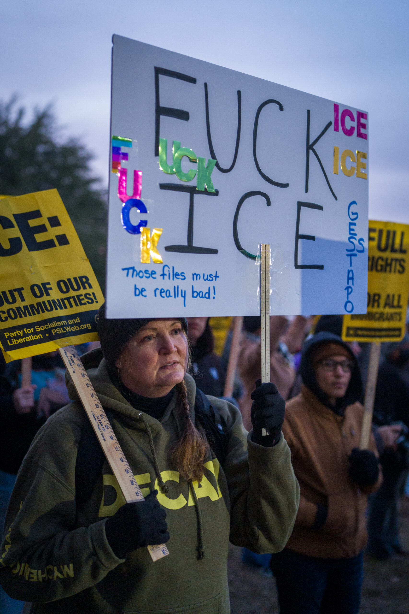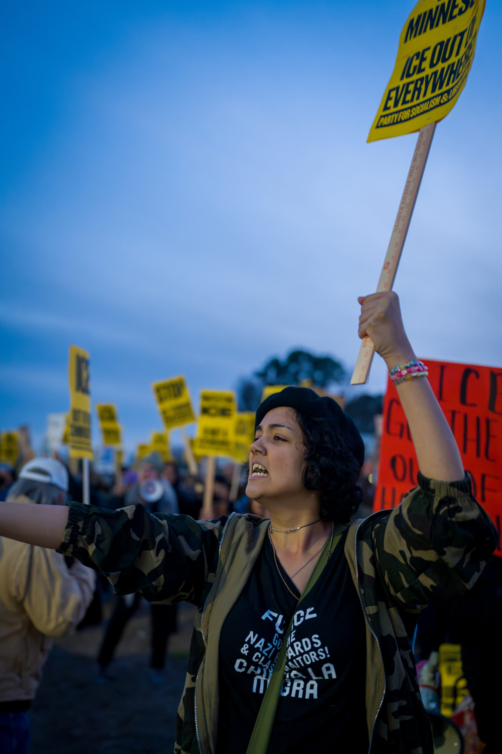 Protesters called attention to the connections between immigration enforcement and broader patterns of state violence. The demonstration was one of dozens of similar protests across the country following the events in Minneapolis.