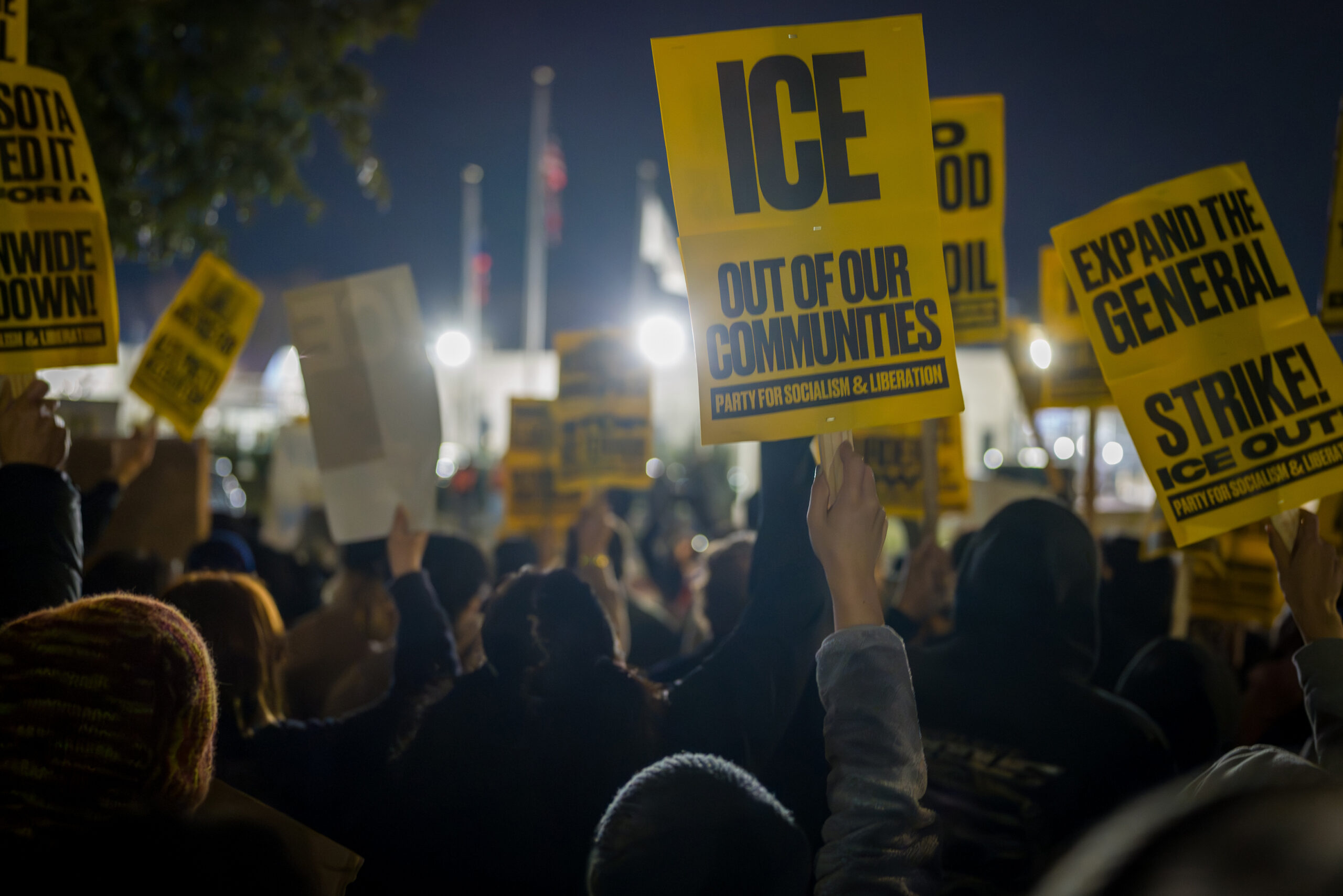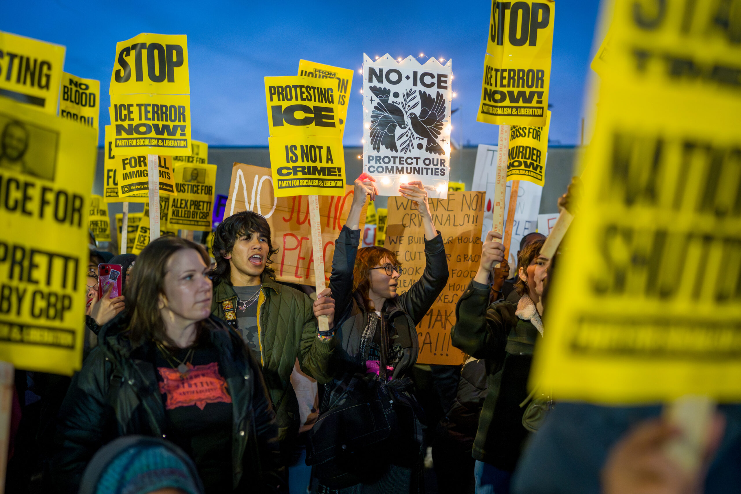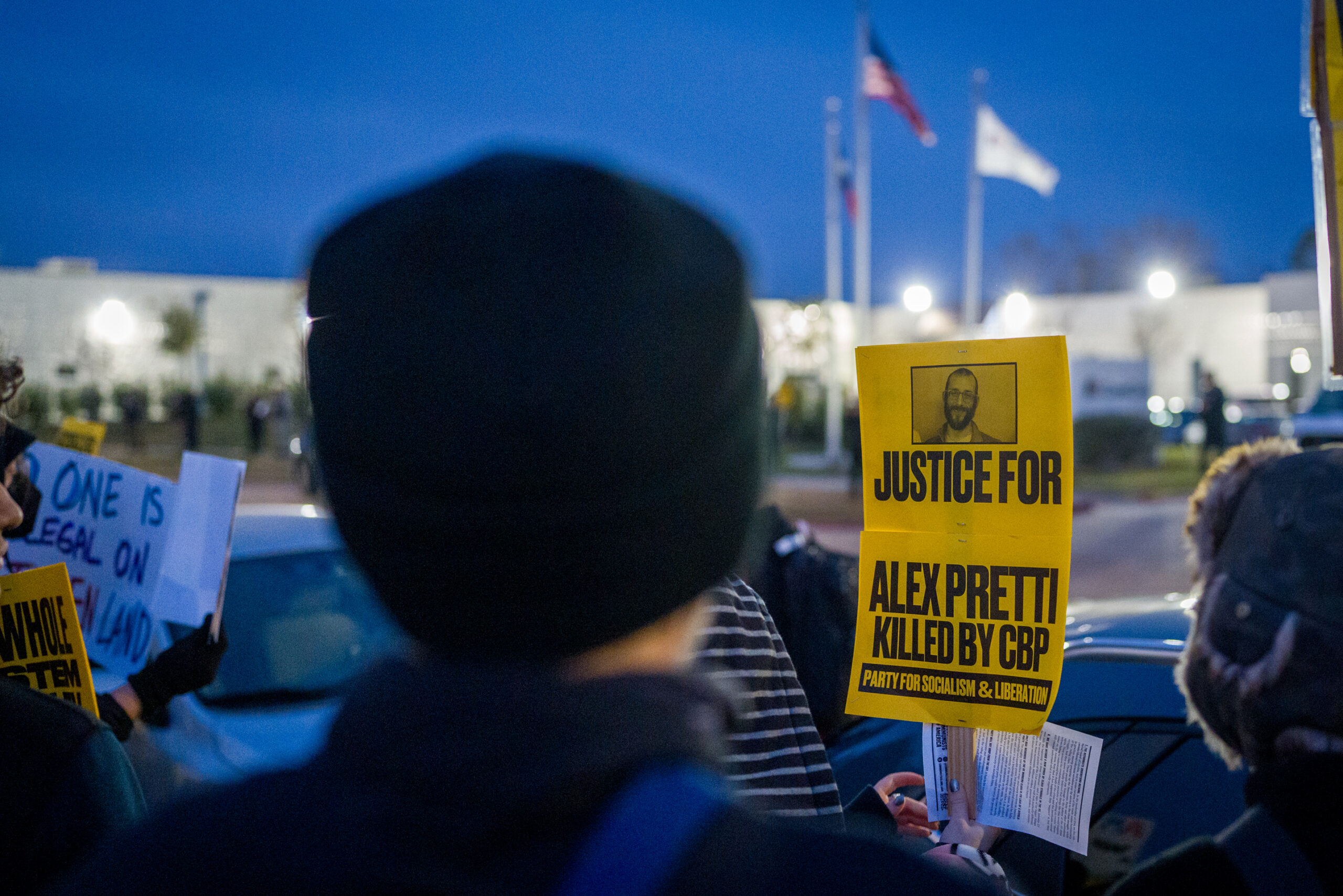 Protesters called attention to the connections between immigration enforcement and broader patterns of state violence. The demonstration was one of dozens of similar protests across the country following the events in Minneapolis.