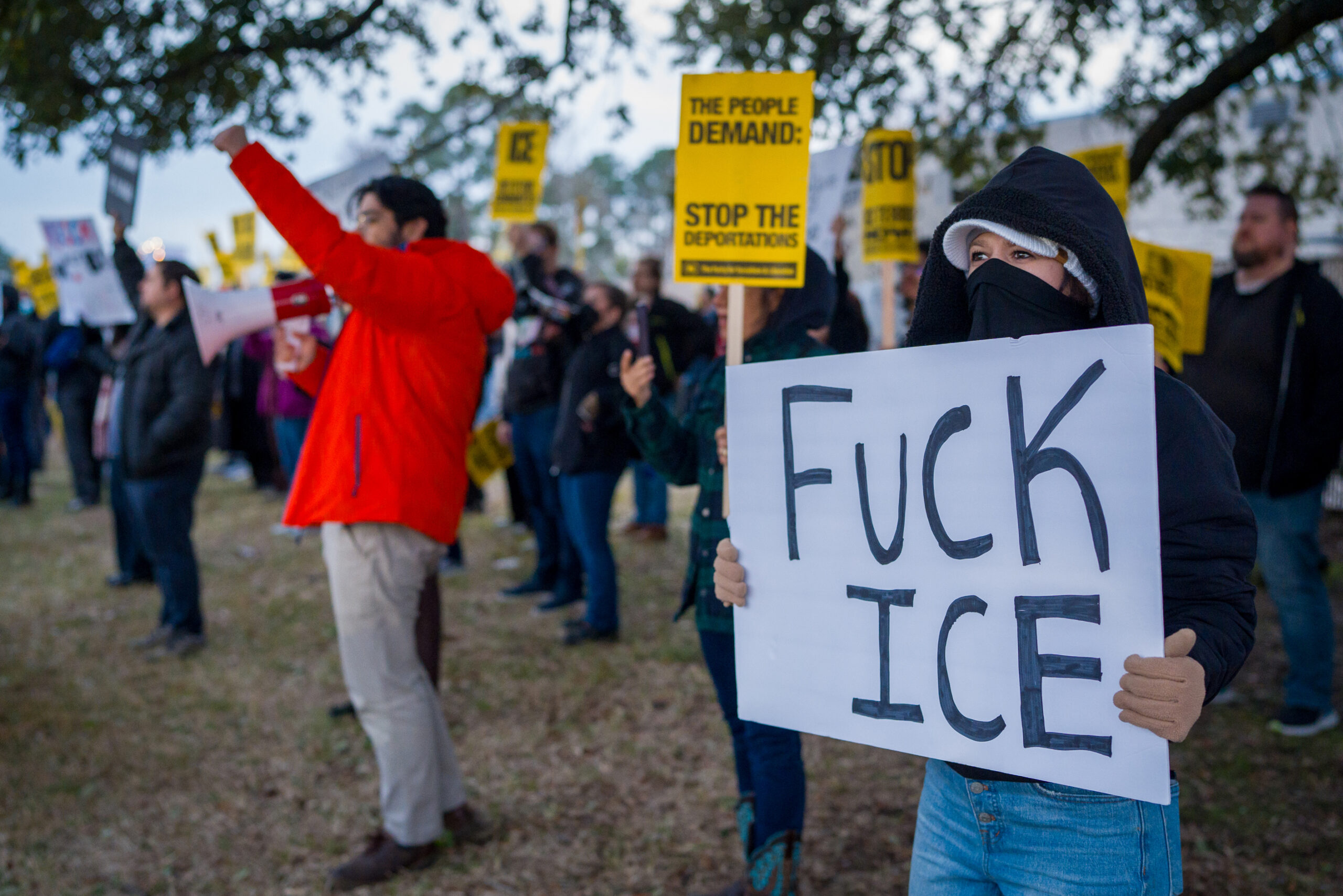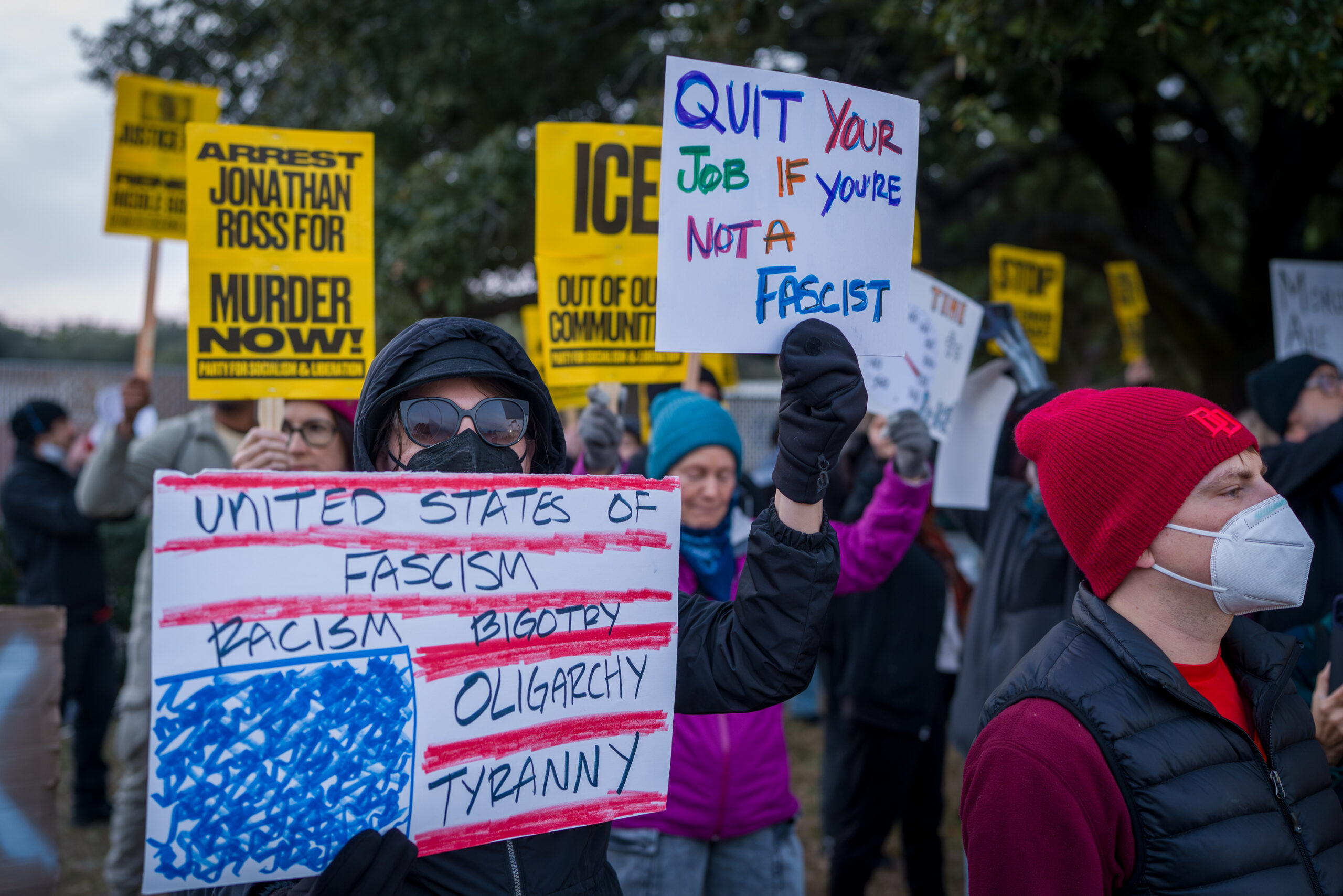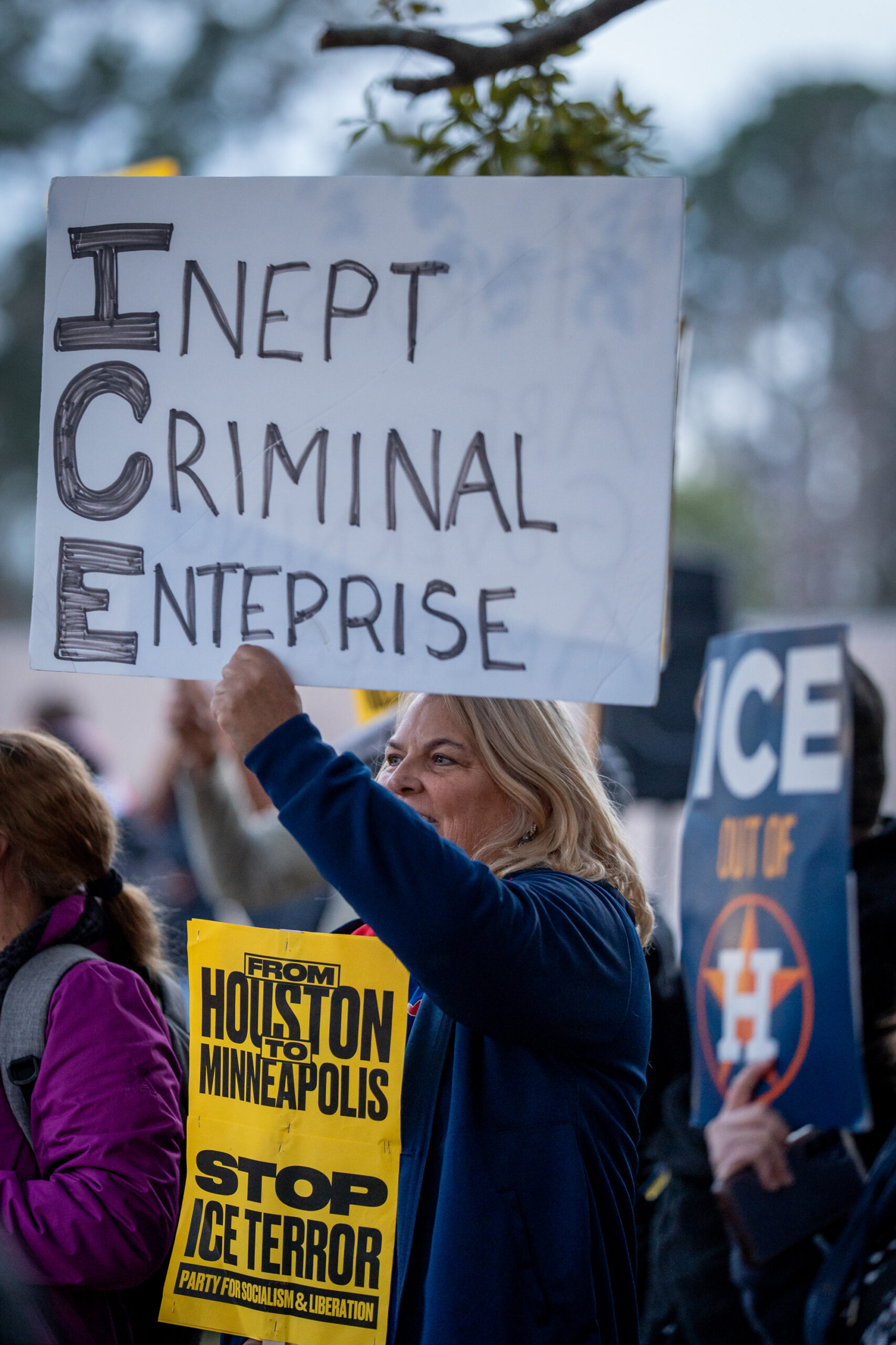 Demonstrators gathered outside the CoreCivic immigration detention center in north Houston for ICE OUT!, a protest organized in response to recent violence in Minneapolis, including the killings of Renee Good and Alex Pretti. The protest focused on opposition to U.S. Immigration and Customs Enforcement (ICE) and its role in immigration detention.