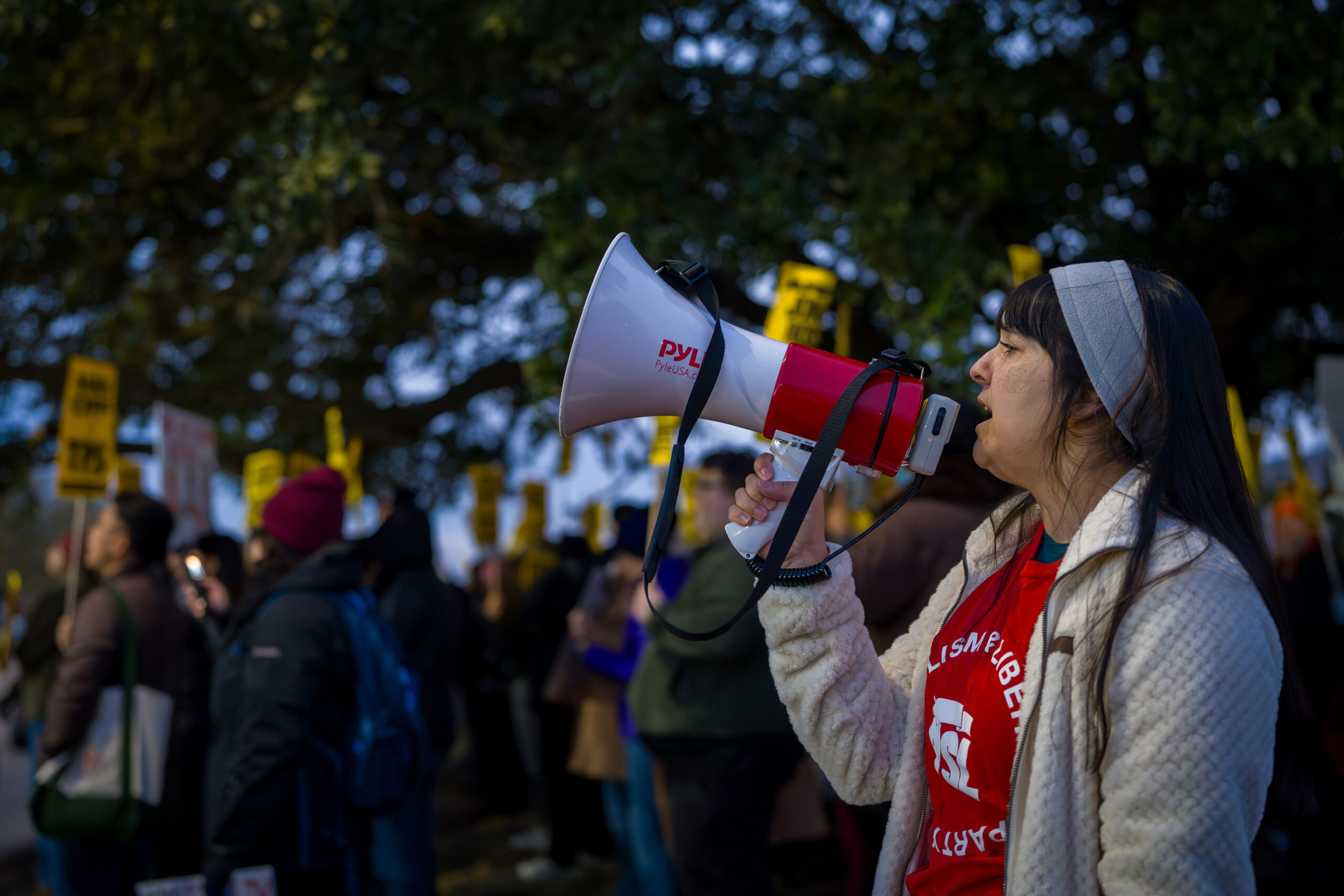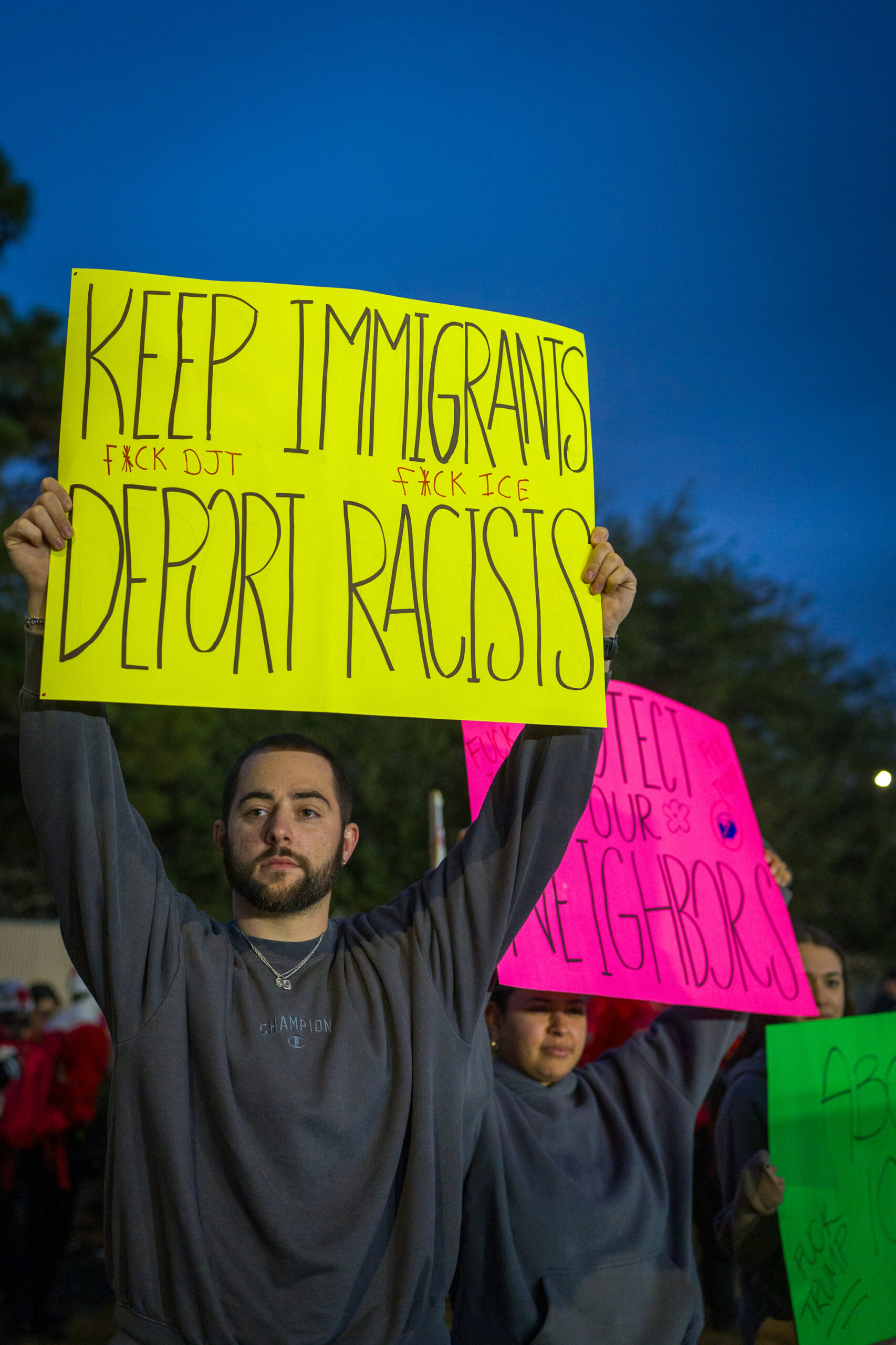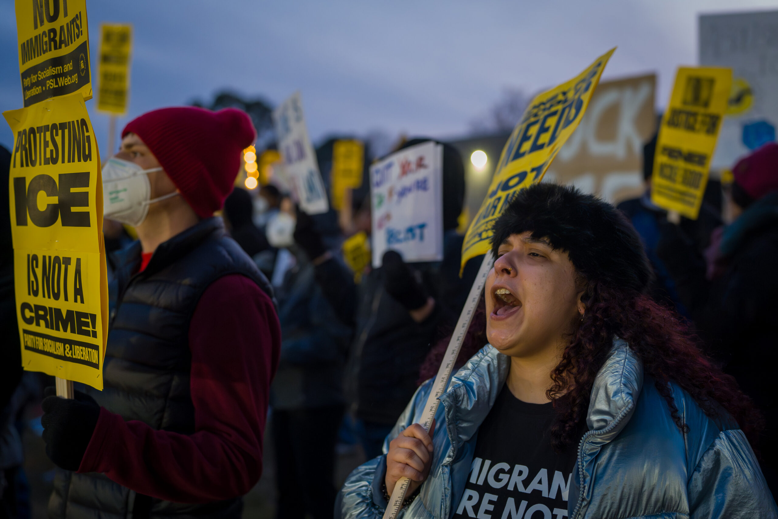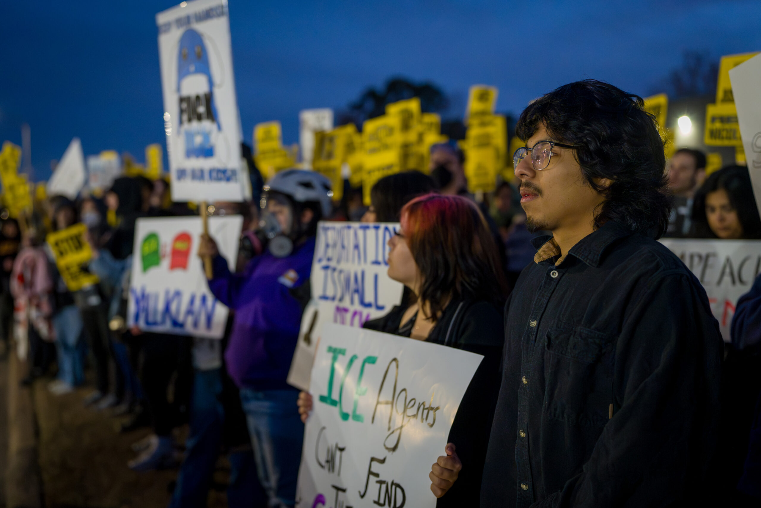 Demonstrators gathered outside the CoreCivic immigration detention center in north Houston for ICE OUT!, a protest organized in response to recent violence in Minneapolis, including the killings of Renee Good and Alex Pretti. The protest focused on opposition to U.S. Immigration and Customs Enforcement (ICE) and its role in immigration detention.