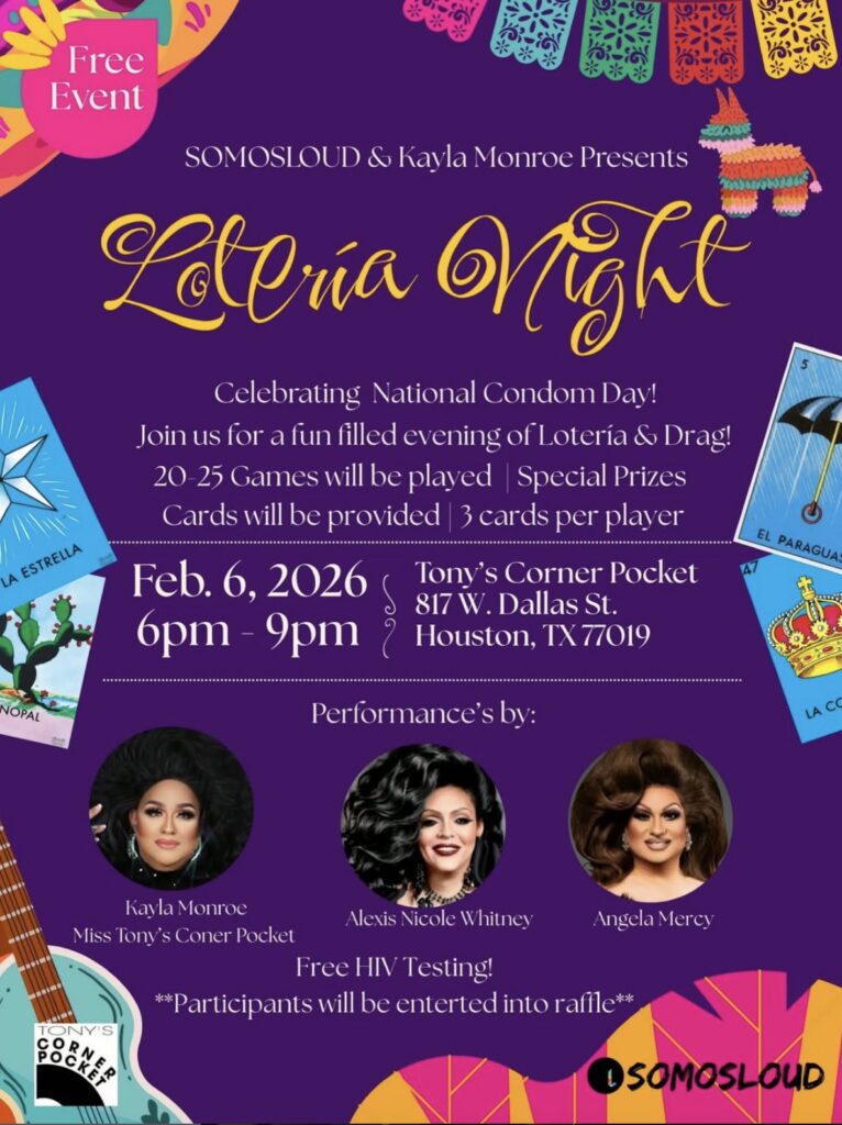Somos LOUD Houston celebrates National Condom Day with an evening of lotería featuring performances by Kayla Monroe, Alexis Nicole Whitney, and Angela Mercy. Tony’s Corner Pocket, 817 W Dallas St. 6 p.m.