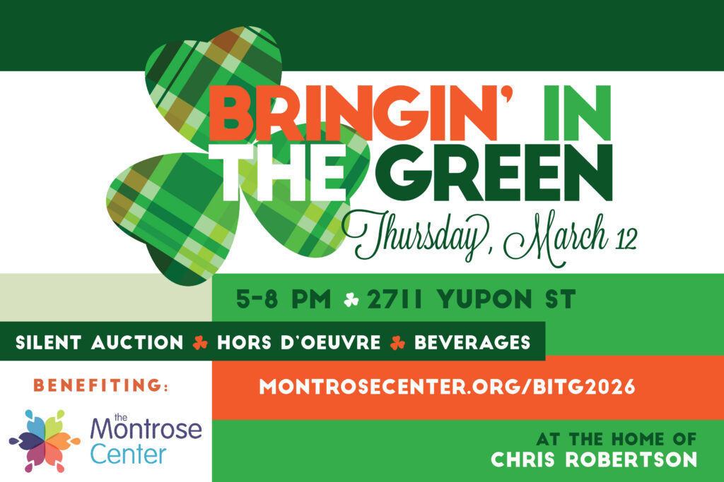 Join hosts Luis Adame and Chris Robertson, and Paul Brockman and Scott Greenwood, for the 34th annual Bringin’ in the Green benefiting the Montrose Center. With open bar, hors d’oeuvres, and a silent auction of luxury items, this is one St. Patrick’s Day party you don’t want to miss. 2711 Yupon St. 5 p.m.