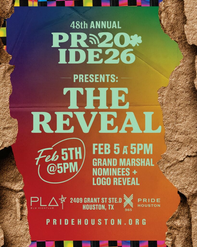 Pride Houston 365 reveal the 2026 Grand Marshal nominees and 48th annual Pride Parade and Festival logo. This event marks the beginning of Pride Houston’s 2026 celebration season and honors both the creative talent and community leaders who help shape Houston’s LGBTQ story. Play Nightlife, 2409 Grant St. 5 p.m.
