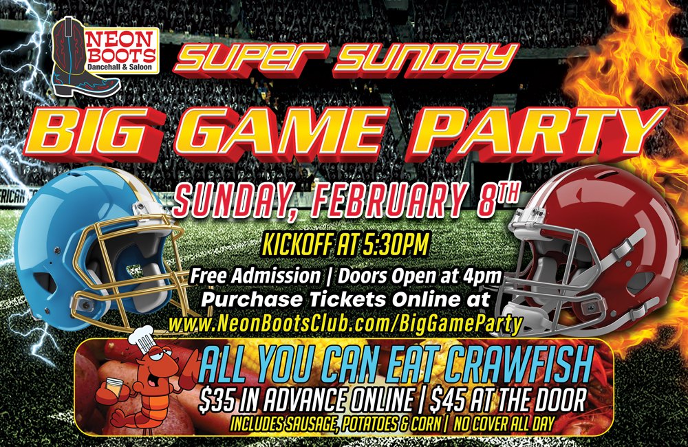 Neon Boots Super Sunday Big Game Watch Party and All-You-Can-Eat Crawfish