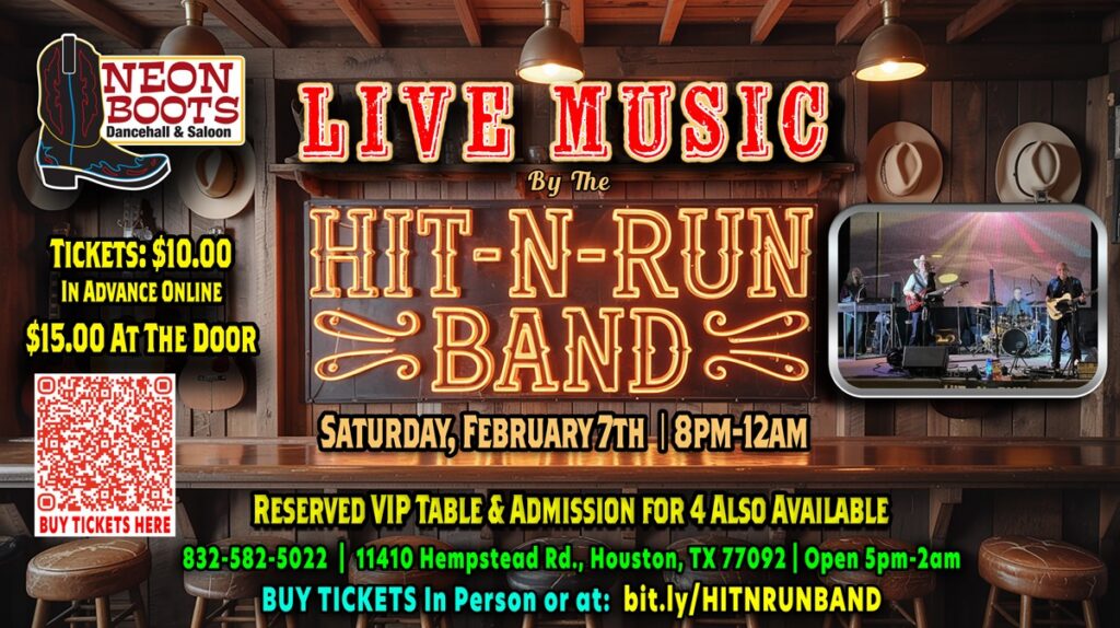 Enjoy an amazing night out with live country music from the Hit-N-Run Band at Neon Boots Dancehall & Saloon. 11410 Hempstead Rd. 8 p.m.