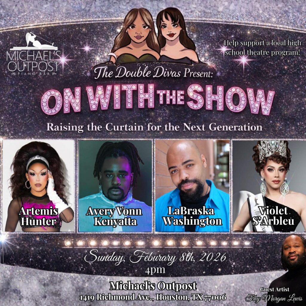 Join Artemis Hunter, Avery Vonn Kenyatta, LaBraska Washington, and Violet S’Arbleu for On With the Show, an afternoon of big voices, sparkle, and cabaret chaos. All tips from the show support local high school theatre students. Michael’s Outpost, 1419 Richmond Ave. 4 p.m.