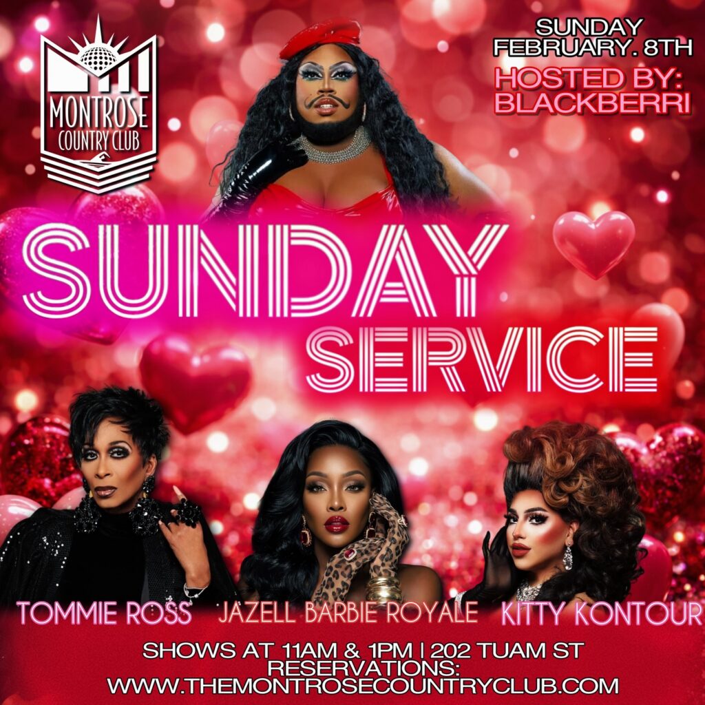 The Montrose Country Club presents Sunday Service Drag Brunch. This week, Dynasty Banks hosts shows featuring spectacular performances from Tommie Ross, Jazell Barbie Royale, and Kitty Kontour. 202 Tuam St. Shows at 11 a.m. and 1 p.m.